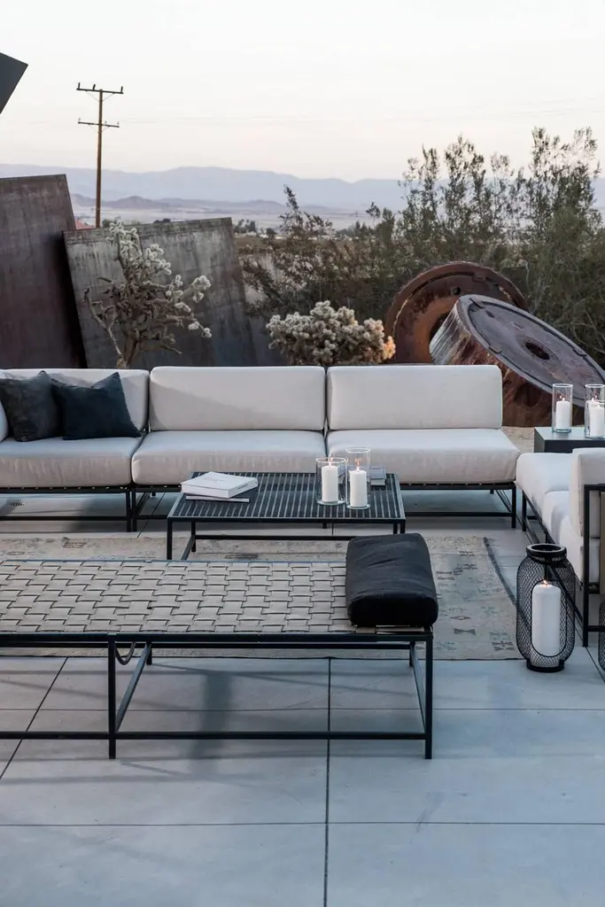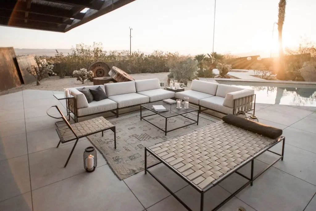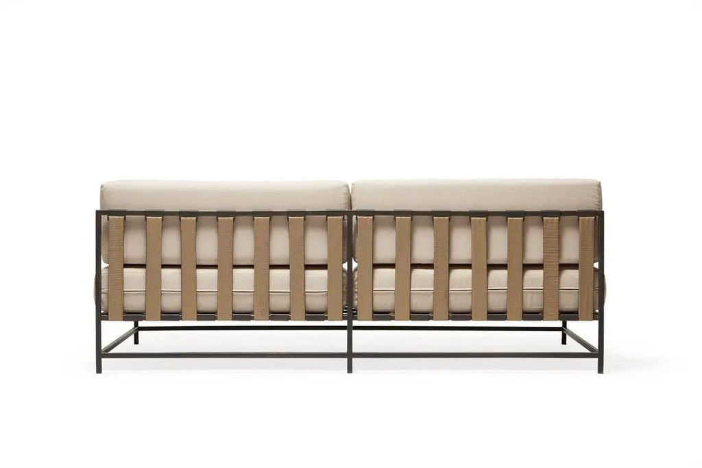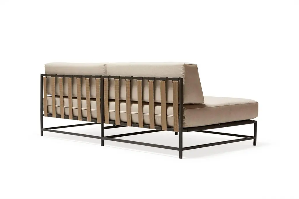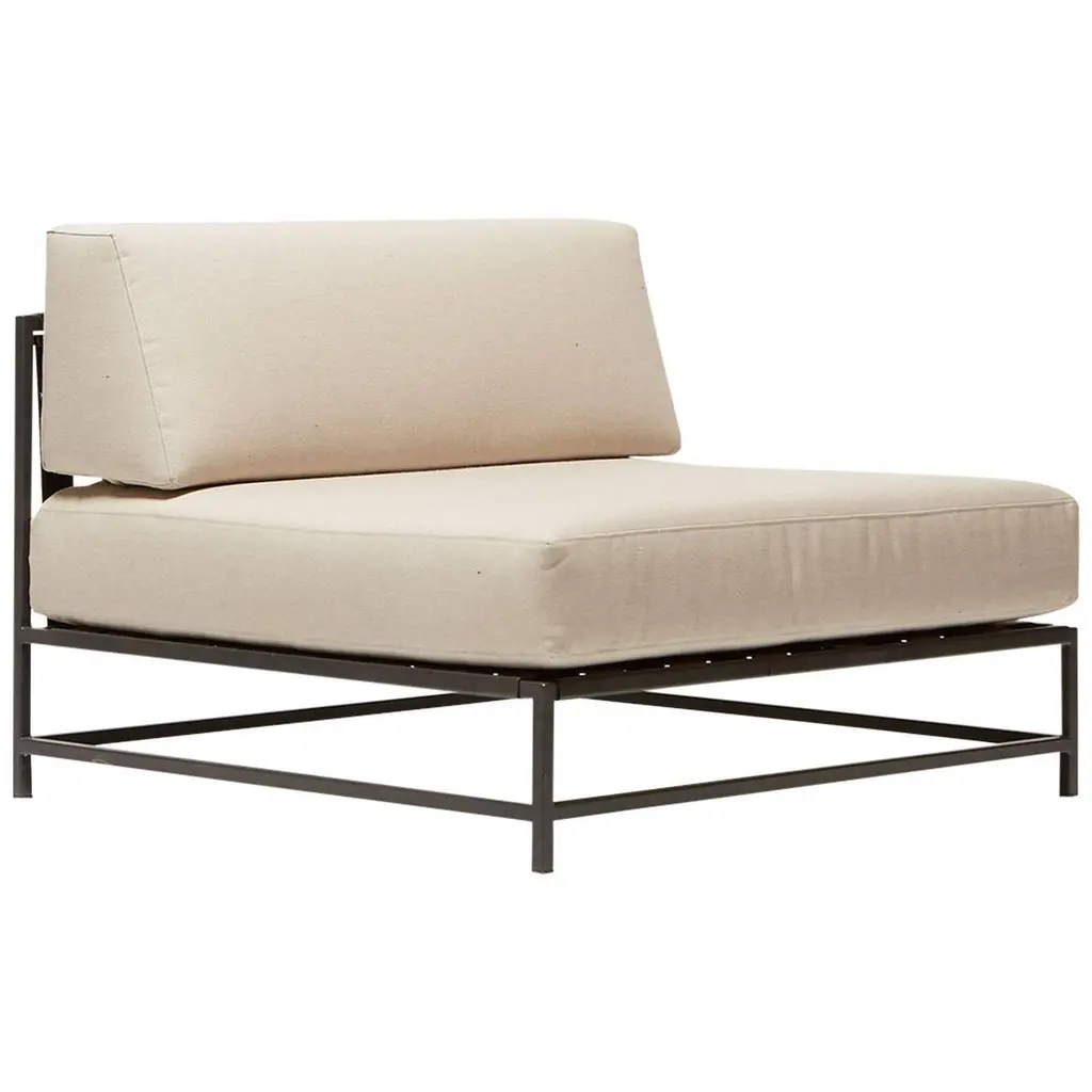 Inspired by weekend visits to the stark desert landscapes found a few hours east of Los Angeles, this collection is composed of steel frames that have been zinc primed and powder coated for rust resistance, interwoven stretch webbing for a soft and springy seating experience, and UV and weather resistant Sunbrella Heritage fabric. Custom dimensions, materials, and finishes are available. The loveseat can be a comfortable seat on its own, or used as part of our Modular Sectional.Shown here with cream upholstery and charcoal frame, with tan or black webbing. Other materials and finishes are available.This item is made to order, in Los Angeles.