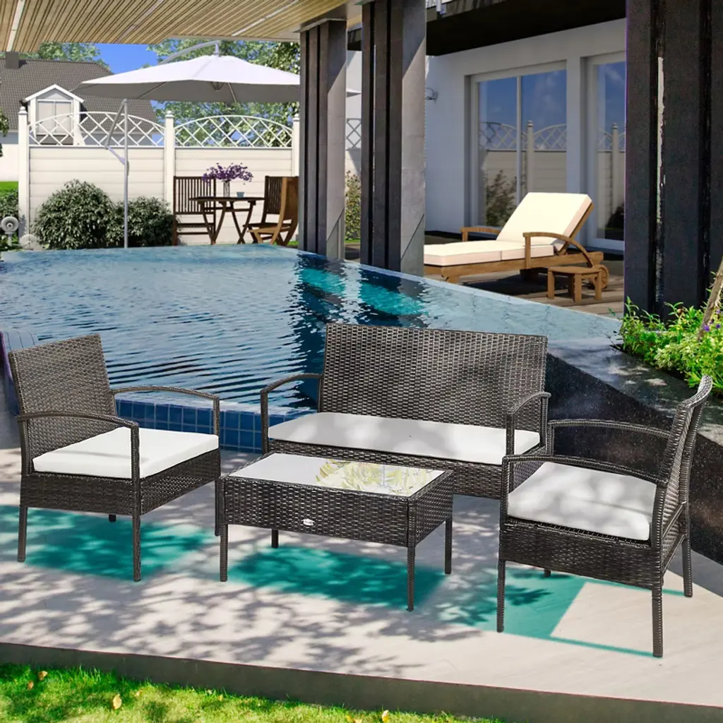 Comfort and style shouldn't be barred from the outside. Turn your balcony, porch, yard, or garden into a sitting space you can enjoy. Outsunny offers an outdoor furniture set with chairs, a couch, and a coffee table. Invite over guests; dine, drink, and enjoy conversation on plush padded seats. Hand-woven, with an all-weather build, the PE rattan makes a statement as a boho accent that's backyard-ready. Get out, get comfy, get Outsunny.