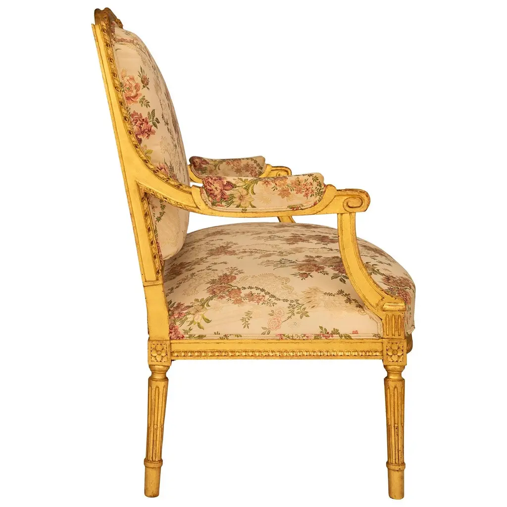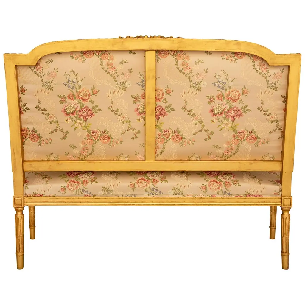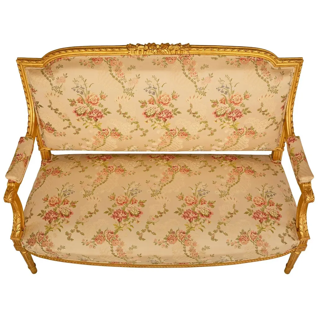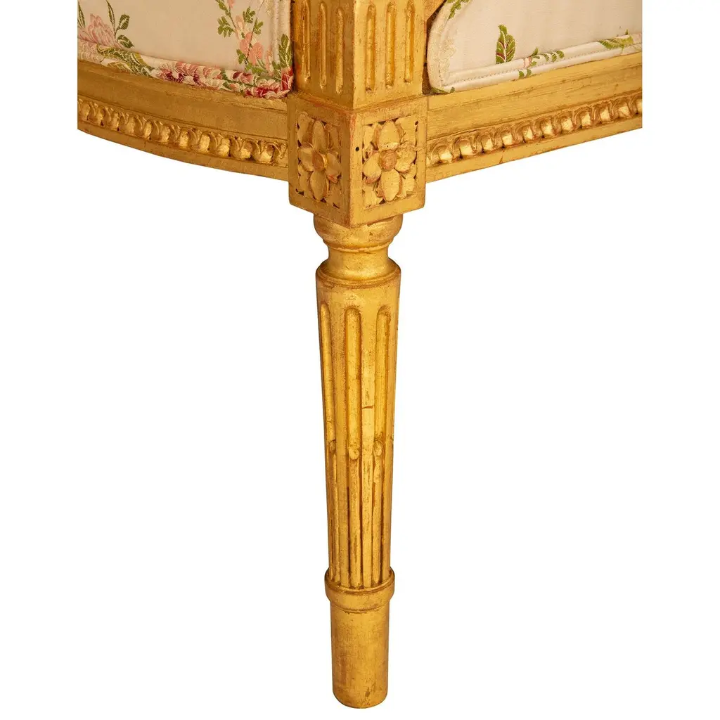 A decorative and most elegant pair of French 19th century Louis XVI st. Giltwood settees. Each beautiful settee is raised on four straight tapered and fluted legs with finely carved rosette top cap blocks. The rosette blocks above each leg flank the front and both side aprons which display a fine band of egg and dart patterned designs. The carved acanthus leaves at the base of each arm lead up to the scrolled hand rest and upholstered arm rest. The lovely upholstered backrest is edged with attractive carved spiraling designs and a bowed ribbon central reserve.