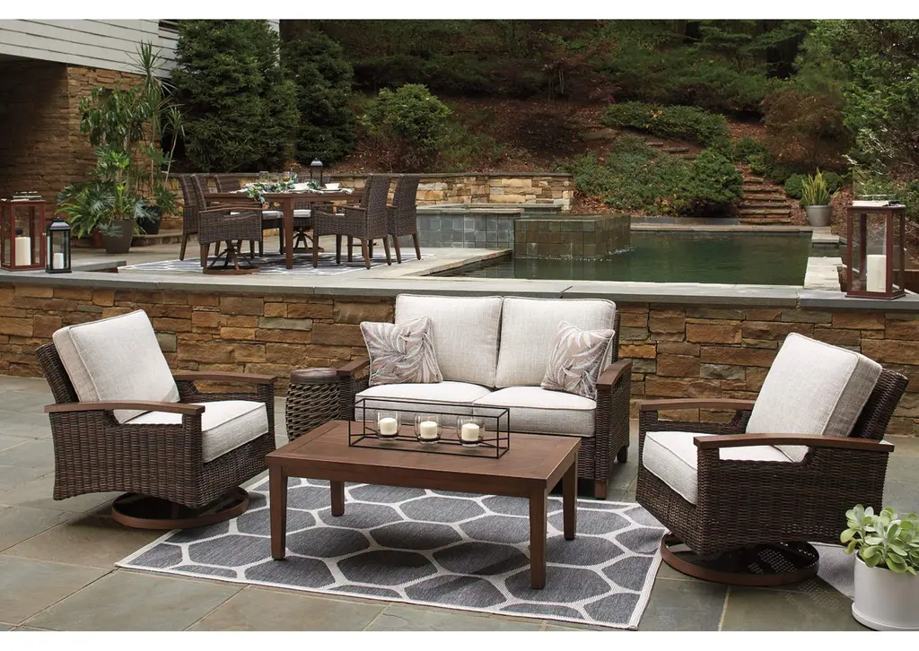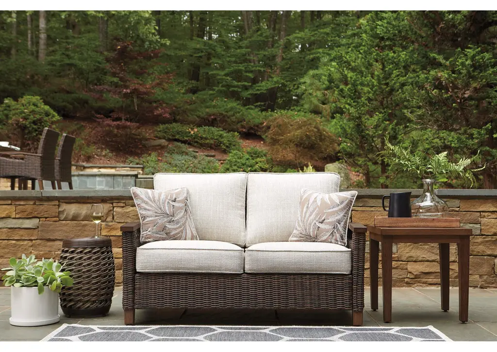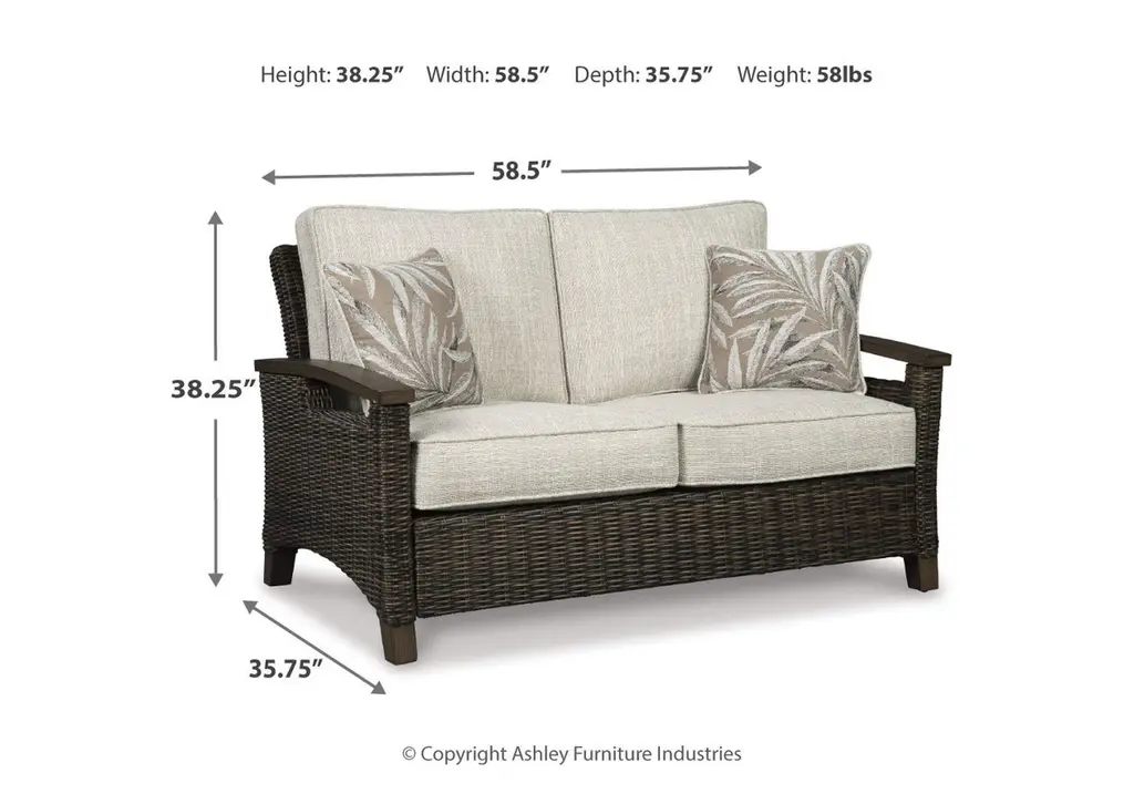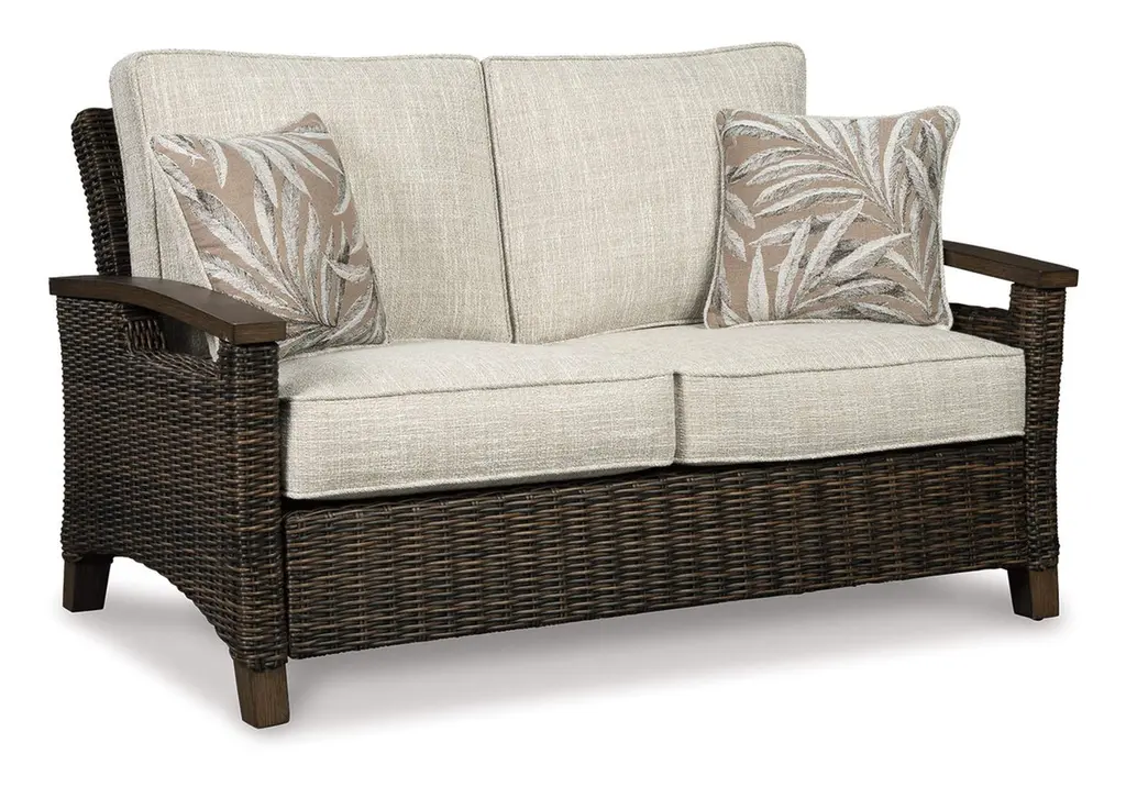 Pretty enough for trendy interiors, yet durable enough to weather the elements, the Paradise Trail outdoor loveseat rises to the challenge beautifully. Handwoven resin wicker over rust-proof aluminum merges high style with low maintenance. Rest assured, though the exposed armrests and feet look remarkably like wood, their sturdy aluminum construction is perfectly suited for alfresco living. Plush seat cushions and throw pillows wrapped in high-performing Nuvella® fabric aim to please. Weight 73.000 lbs. (32.85kgs.)
