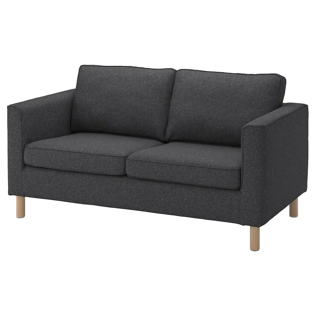 PÄRUP Loveseat - Gunnared dark gray. Timeless design with delicate details such as piping around the armrests and wooden legs. The legs leave space under the sofa in order to create an airy look and make it easier for you when cleaning.