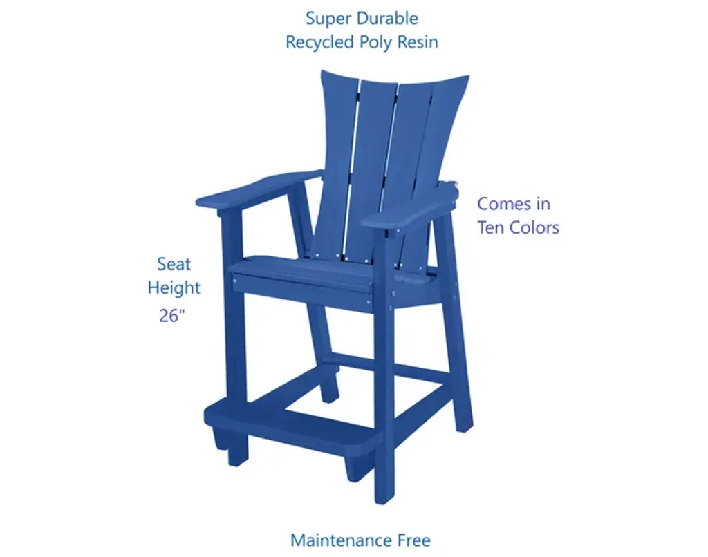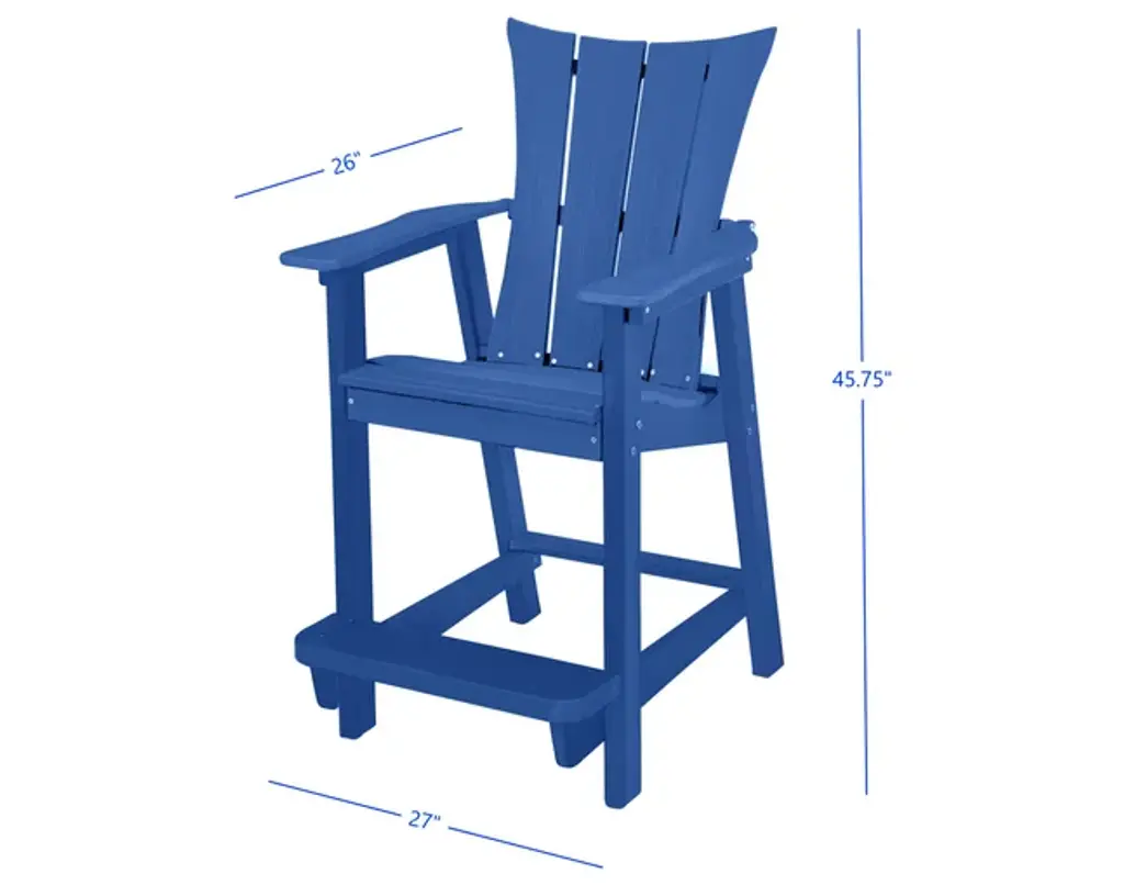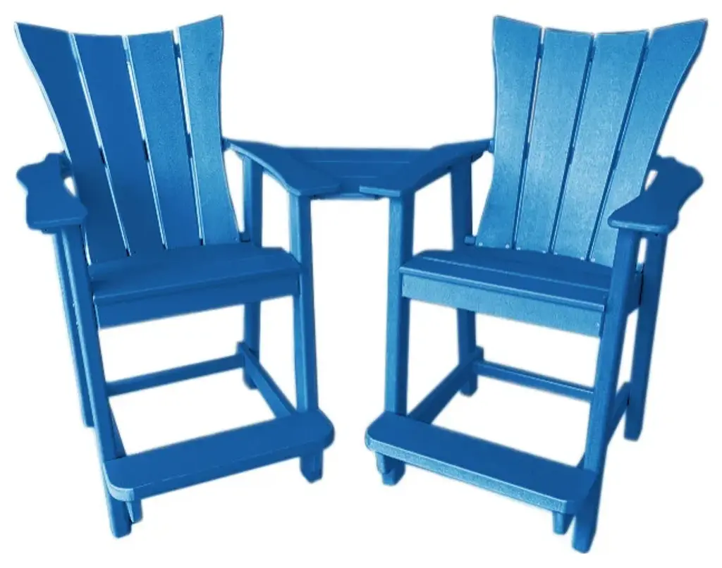 Lakewoods High Top Adirondack Chairs with TableAll-weather poly lumber allows you to use this adirondack chair set outside all year long with no splitting, cracking or fadingModern outdoor furniture with scooped back designSustainable, recycled & comfortable poly lumberRemovable slide-in side table10 fade-resistant colorsGreat small space outdoor furniture ideaLow maintenance & easy to cleanMade in the USA with superior craftsmanship & heirloom quality (10-year warranty)Free shipping & quick assemblyLakewoods High Top Adirondack Chair DimensionsOverall Set: 84" W x 39" D x 46" HSeat height is 26"450 lb. weight limitShipping Dimensions: (box 1) 37 x 27 x 12, 68 lbs.; (box 2) 37 x 27 x 12, 68 lbs.Sit back, relax, and enjoy your outdoor patio with the Lakewoods poly high top adirondack chairs with table. This versatile poly outdoor furniture adds comfort and style to any patio. Whether you're city living in an apartment with a balcony, lakeside at your cabin, or have a view of the ocean from your patio, this all weather double adirondack chair set will soon become a staple piece of outdoor furniture to your patio.Like our classic tall adirondack chairs with rounded backs, the Lakewoods style poly chairs are built with durable poly lumber designed to withstand all climates from hot summers to snowy winters to windy coastal regions. No fading, splitting, or cracking - even in hot direct sunlight or salty coastal regions!This balcony set of 2 chairs features a convenient, removable side table; meaning the chairs can be used separately as standalone balcony chairs or together as a set. Each high top adirondack chair is 27" W x 26" D x 46" H and weighs a sturdy 63 lbs. so they won't blow away in the wind. The seat height is 26", allowing you to use them as counter height adirondack chairs.