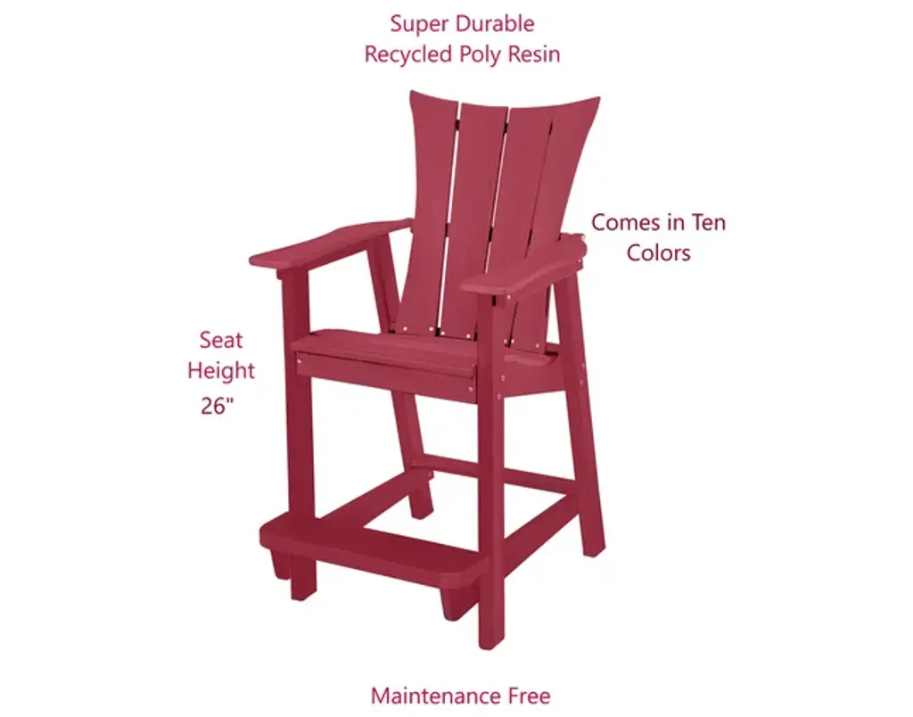 Lakewoods High Top Adirondack Chairs with TableAll-weather poly lumber allows you to use this adirondack chair set outside all year long with no splitting, cracking or fadingModern outdoor furniture with scooped back designSustainable, recycled & comfortable poly lumberRemovable slide-in side table10 fade-resistant colorsGreat small space outdoor furniture ideaLow maintenance & easy to cleanMade in the USA with superior craftsmanship & heirloom quality (10-year warranty)Free shipping & quick assemblyLakewoods High Top Adirondack Chair DimensionsOverall Set: 84" W x 39" D x 46" HSeat height is 26"450 lb. weight limitShipping Dimensions: (box 1) 37 x 27 x 12, 68 lbs.; (box 2) 37 x 27 x 12, 68 lbs.Sit back, relax, and enjoy your outdoor patio with the Lakewoods poly high top adirondack chairs with table. This versatile poly outdoor furniture adds comfort and style to any patio. Whether you're city living in an apartment with a balcony, lakeside at your cabin, or have a view of the ocean from your patio, this all weather double adirondack chair set will soon become a staple piece of outdoor furniture to your patio.Like our classic tall adirondack chairs with rounded backs, the Lakewoods style poly chairs are built with durable poly lumber designed to withstand all climates from hot summers to snowy winters to windy coastal regions. No fading, splitting, or cracking - even in hot direct sunlight or salty coastal regions!This balcony set of 2 chairs features a convenient, removable side table; meaning the chairs can be used separately as standalone balcony chairs or together as a set. Each high top adirondack chair is 27" W x 26" D x 46" H and weighs a sturdy 63 lbs. so they won't blow away in the wind. The seat height is 26", allowing you to use them as counter height adirondack chairs.