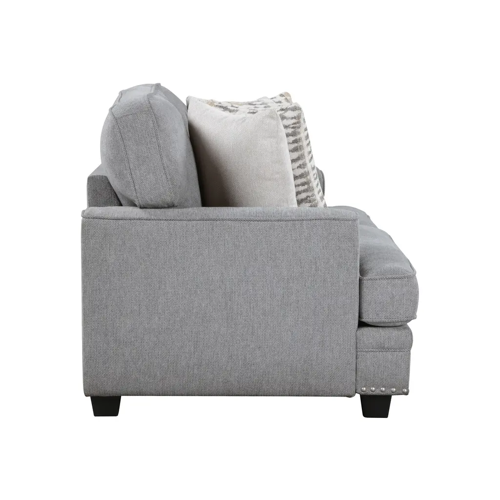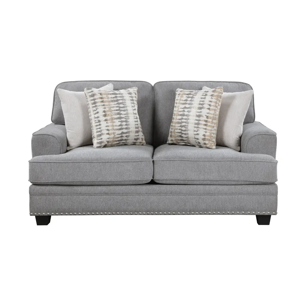 || Fremont & Park - Pombal Collection ||With a transitional design that is a complement to your home’s living room, the Pombal Collection utilizes classic lines, refined texture, and traditional accenting to achieve a universally appealing look. The love seat is covered in solid-hued chenille fabric upholstery. Nail head trim accents the base rail, while profile-defining welting provides a tailored finish. Complementing contrast toss pillows are paired with the love seat. This collection is offered in gray and sand colors.HighlightsAbout CushionsProduct DimensionExplore Pombal CollectionCare InstructionBuyer disclaimer