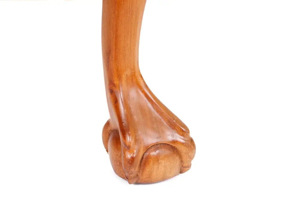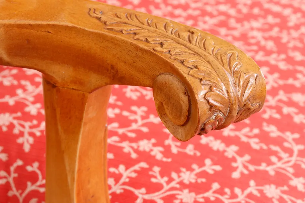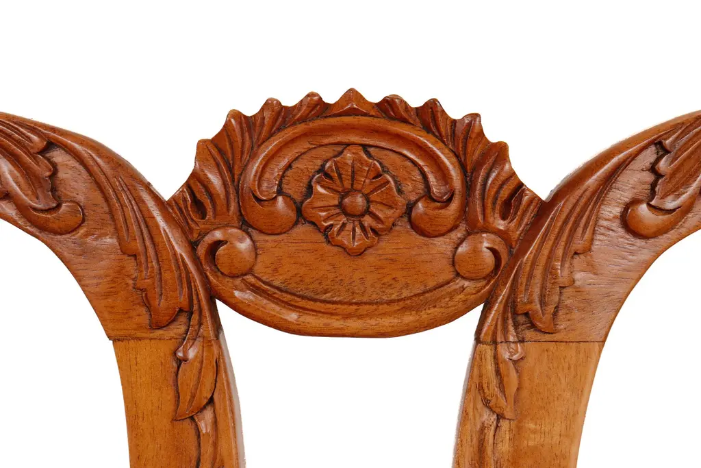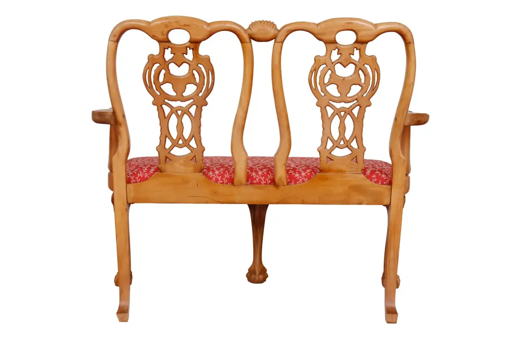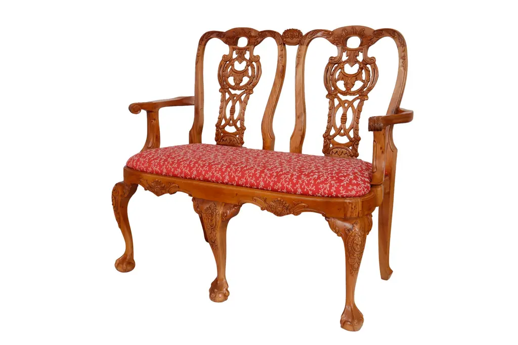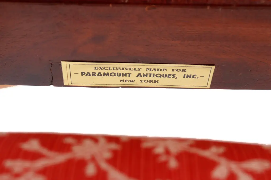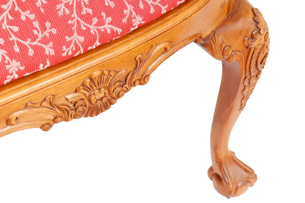A Queen Anne style two seat settee, custom made for Paramount Antiques of New York. The seat back has rounded shoulders carved with an acanthus leaf trim and is supported with two pierced back splats. Outward flared arms are carved with trailing acanthus over scrolled handholds. Cabriole legs in front finish in ball and claw feet. The seat is upholstered in a pink strie floral fabric. Seat height 20.5", arm height 27.5".