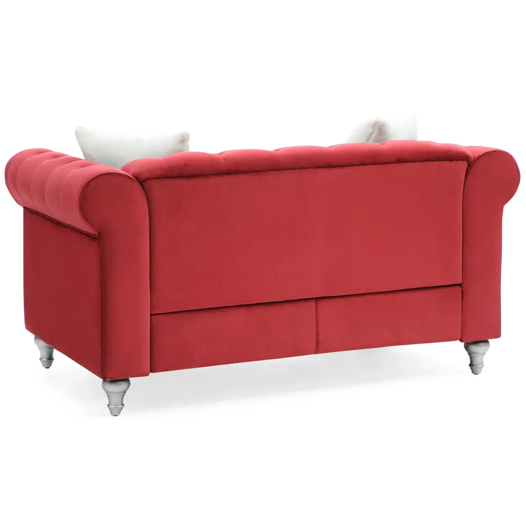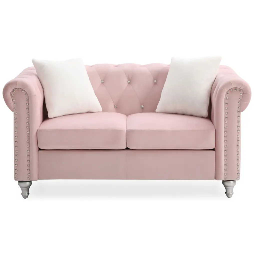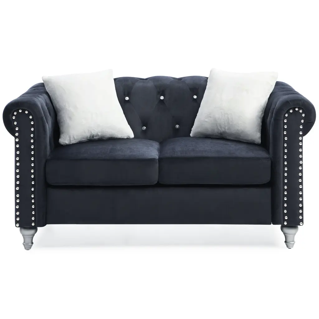 Upgrade your living room with the stylish Raisa Microsuede Velvet Tufted Loveseat by Glory Furniture. This loveseat features a modern and contemporary design with jewel accent nailheads that add a touch of sophistication to your space. Crafted from high-quality materials, this loveseat is built to last for seasons to come. The microsuede velvet upholstery, rolled arm design, and painted wood legs complete the look, making it the perfect addition to any home.Features: