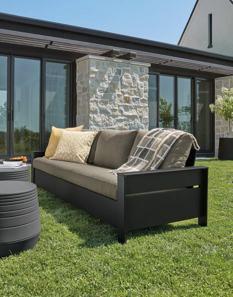 The Rayo modern outdoor sofa is a circular product because its materials can be recycled over and over again; Rayo's high-density polyethylene is blended with recycled plastic to form a sustainable and extremely durable outdoor sofa. The clean design has arms wide enough for drinks or a guest to perch, and the cushion covers are machine-washable.