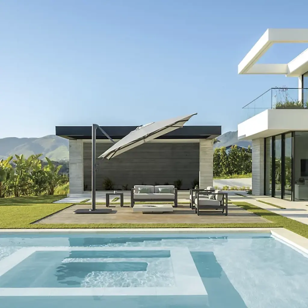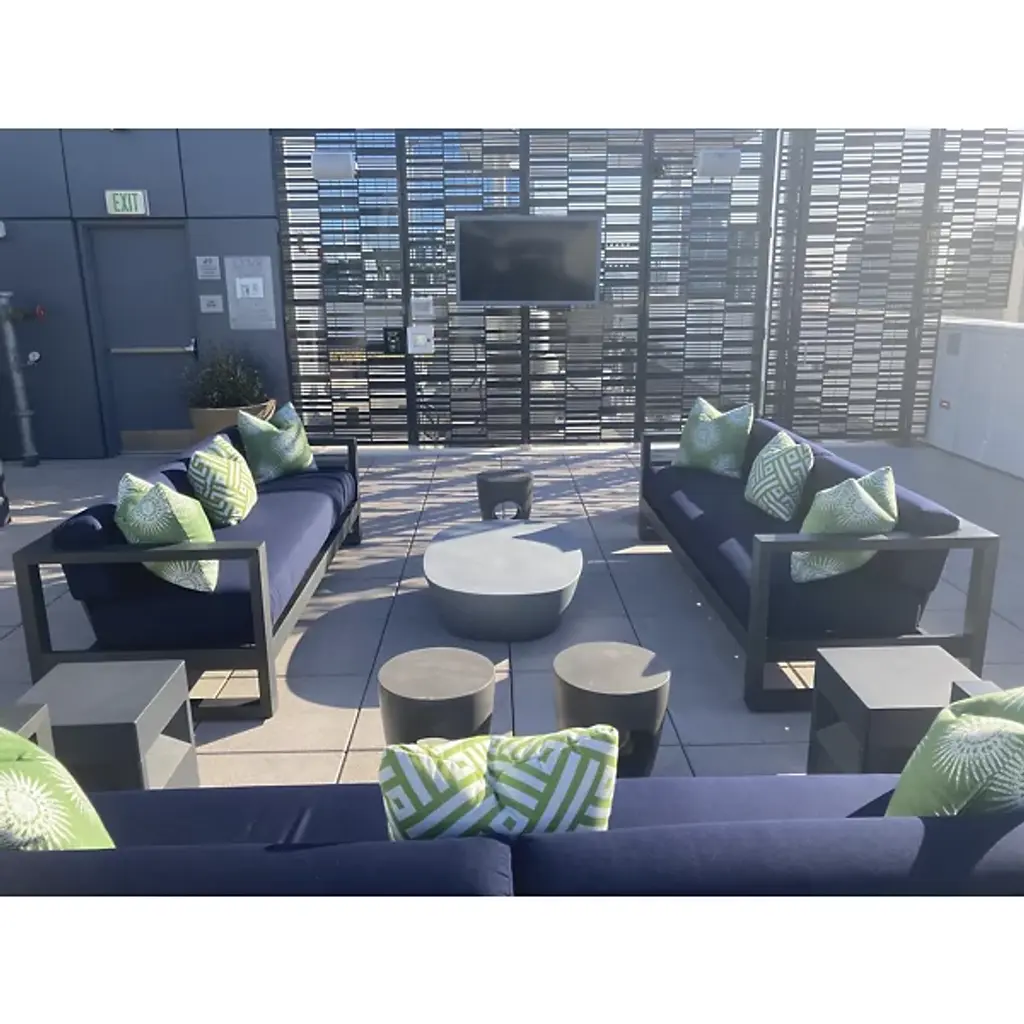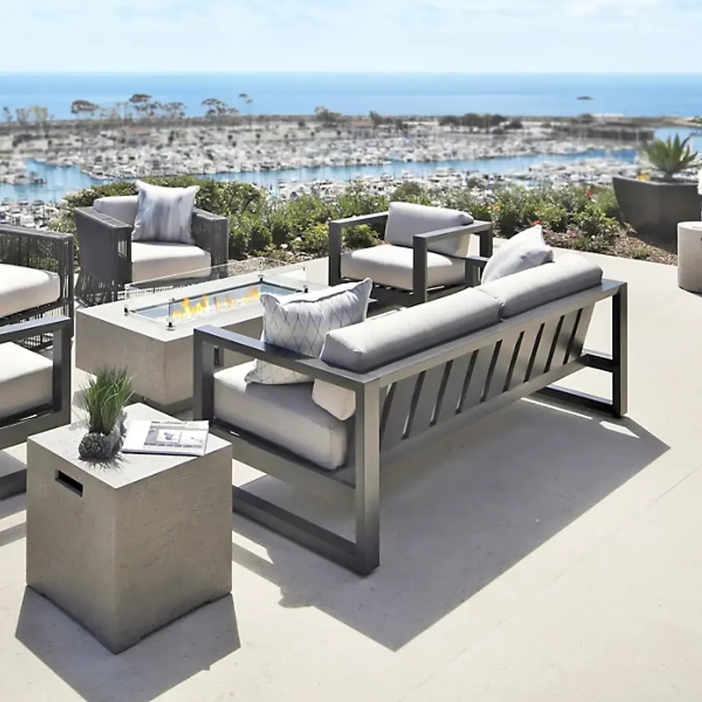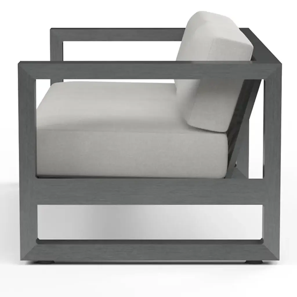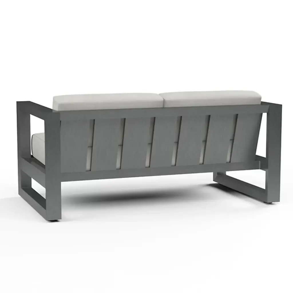 The Redondo Outdoor Loveseat Sofa from Sunset West channels mid-century geometry through its deliberately low back and angular aluminum frame that forms clean rectangular shapes. Bold horizontal emphasis grounds seating arrangements with strong directional lines that echo modernist principles. Its compact two-person scale suits smaller outdoor spaces while delivering maximum design impact. Generous cushioning softens the structured framework, creating comfortable lounging areas where retro-inspired aesthetics meet contemporary outdoor living needs.