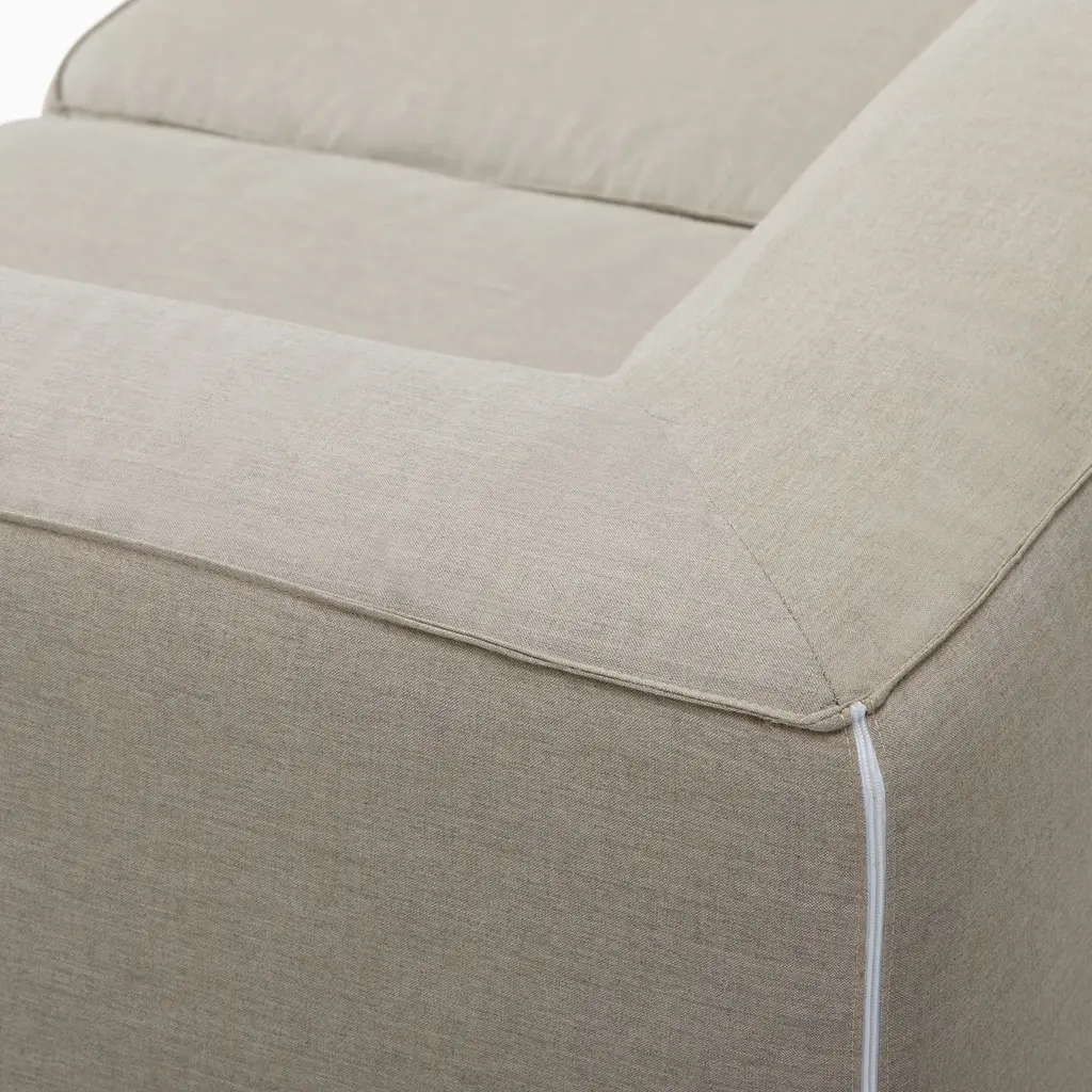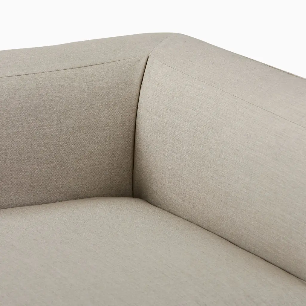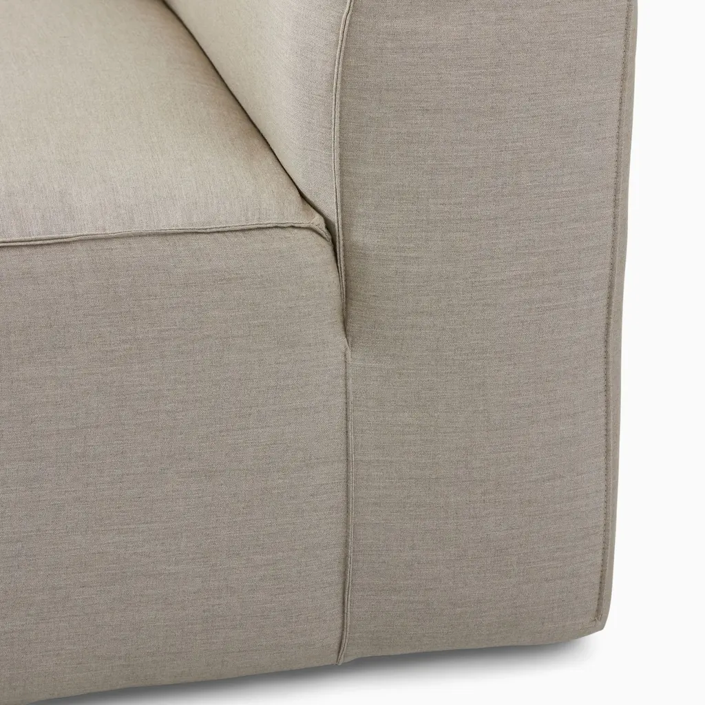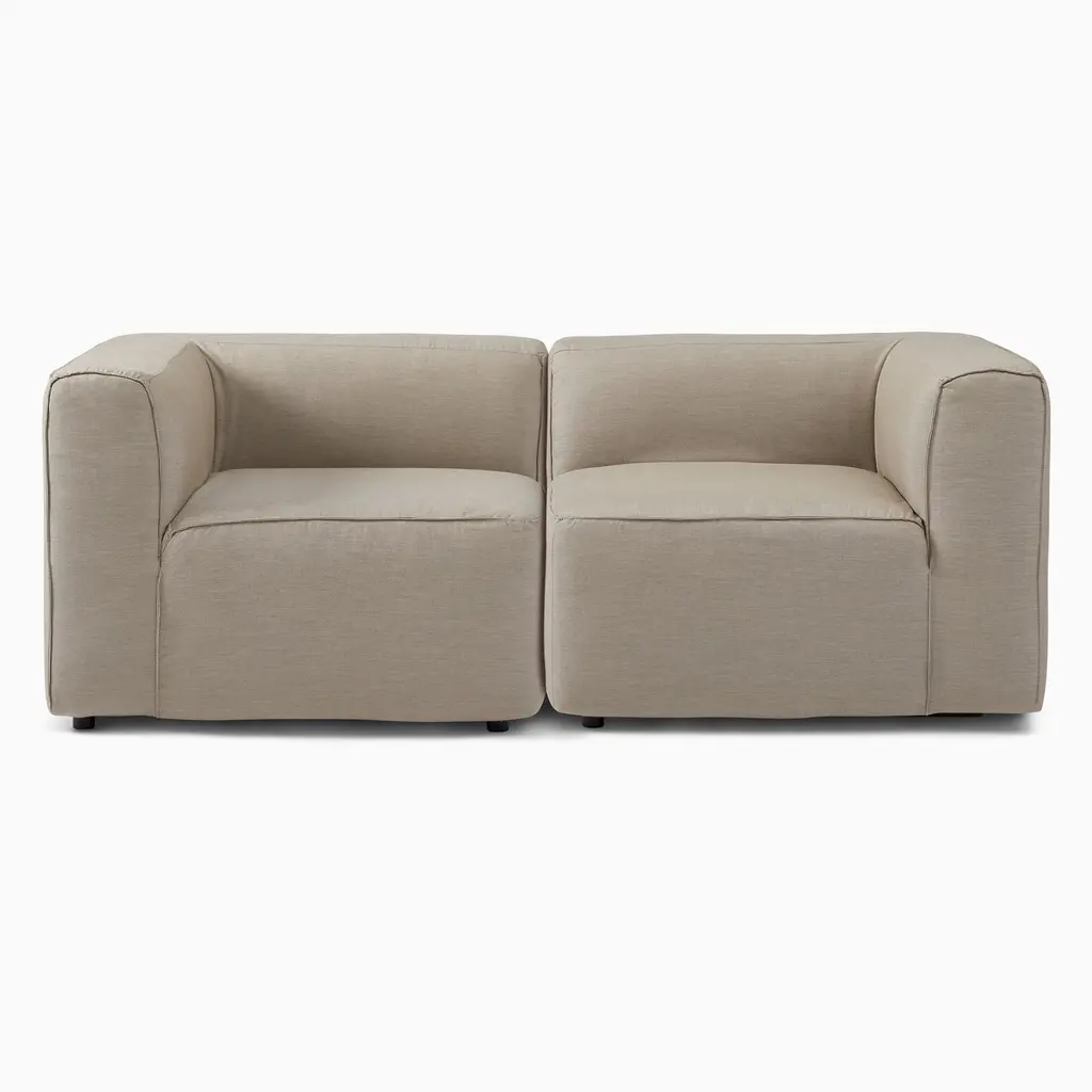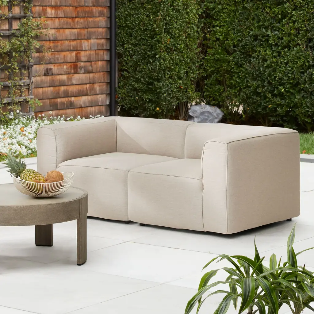 Low, boxy look brings modern style outdoors. Foam padding means it's deceptively plush. Deep seats encourage laid-back lounging. Hand-built frames with hand-finished upholstery.