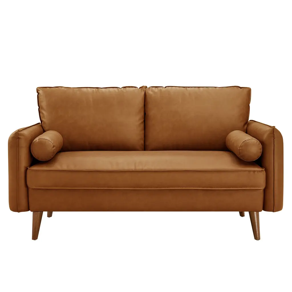 Give new vitality to your home or apartment with the Revive Faux Leather Loveseat. With its sleek, tailored profile and two plush bolster pillows, this modern love seat invites guests to settle in and stay awhile. Upholstered in rich vegan leather, this loveseat sofa exudes an approachable elegance, perfectly complemented by its clean lines and splayed wood legs. Whether placed in a cozy corner or serving as a stylish centerpiece in your living space, the Revive small sofa brings a touch of mid-century modern flair to any setting, creating a welcoming spot for relaxation and conversation. With its perfect blend of contemporary design and classic comfort, the Revive 2-seater sofa effortlessly enhances the ambiance of any space. Weight Capacity: 661 lbs.Vegan Leather Upholstery Dense Foam Padding Two Bolster Pillows Sinuous Spring Support Wood Legs With Non-Marking Glides Assembly RequiredOverall Product Dimensions: 33.07"L x 59.45"W x 32.28"HSeat Dimension: 21.66"L x 50"W x 18.51"HArmrest Dimension: 31.7"L x 4.73"W x 24.81"HBackrest Dimension: 1.77"L x 50"W x 28.94"HCushion Thickness: 7.09"HLeg Dimension: 2.36"L x 2.36"W x 6.3"HOne - Revive Loveseat