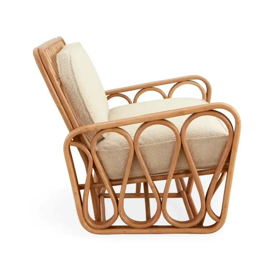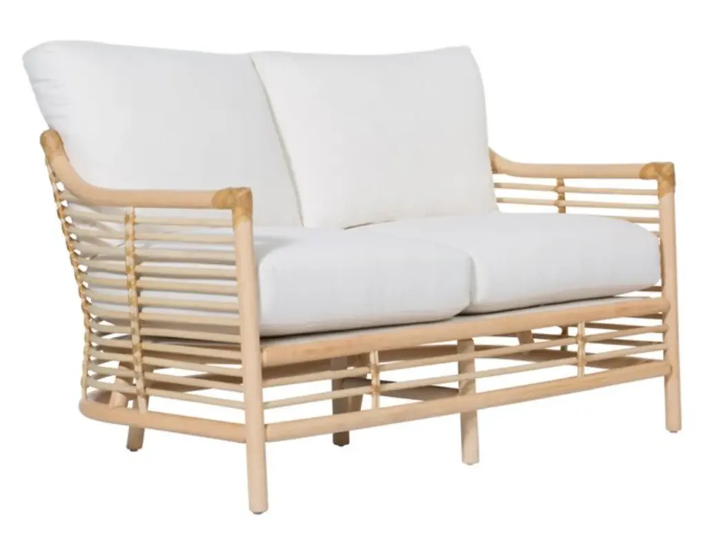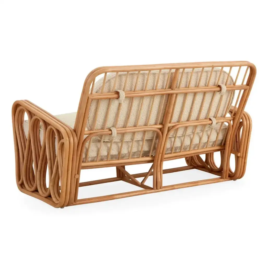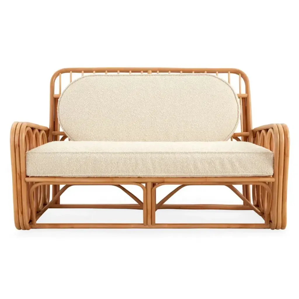 Our Riviera collection is the update on classic French 50s rattan you've been waiting for. Evoking grand global glamour, each piece features exquisite craftsmanship—reeds are steeped in water to increase their flexibility, fastened to sinuous frameworks by hand, then finished with a clear lacquer to enhance the natural rattan coloring. Our Riviera Settee features a capsule-shaped back cushion and thick seat, both clad in oatmeal bouclé. Pair it with our Riviera Lounge Chair and Riviera Tuffet to create the perfect spot for collapsing into reverie after a long day of jet set hijinks.