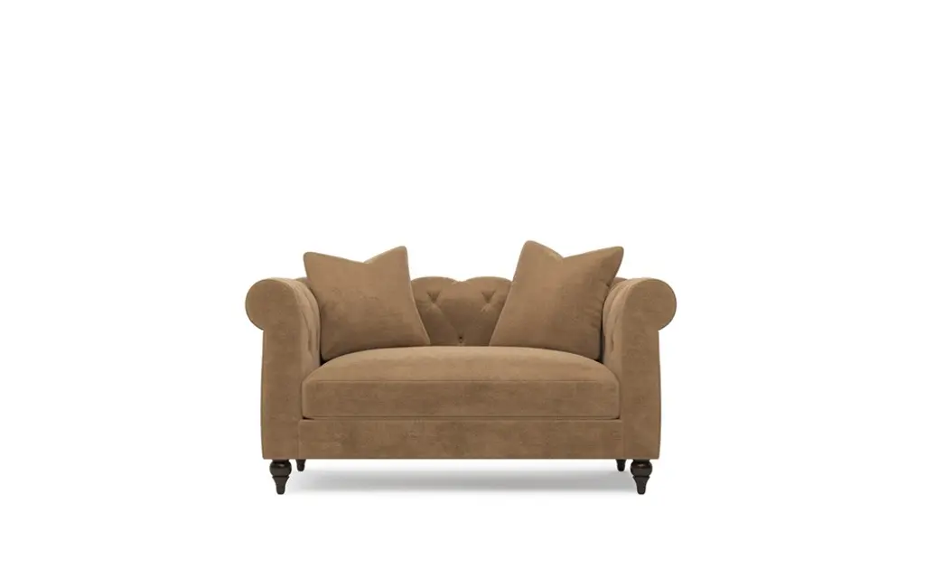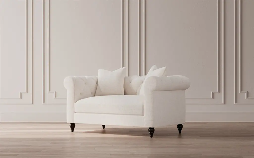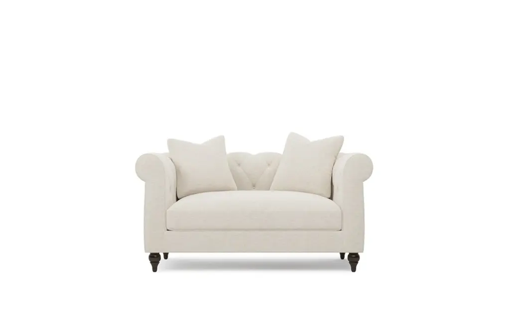 A Kathy Kuo Home exclusive, our 63” Rosehill loveseat puts a modern twist on the traditional Chesterfield style. Designed without pleating for a cleaner look, the timeless silhouette highlights rolled arms, a tufted back, and turned wood legs. A simple, sophisticated bench seat features a custom cushion fill—hypoallergenic Trillium® fiber holds its shape and offers all the comfort of down without the fluffing maintenance. This charming loveseat is a perfect choice for any classic living room.