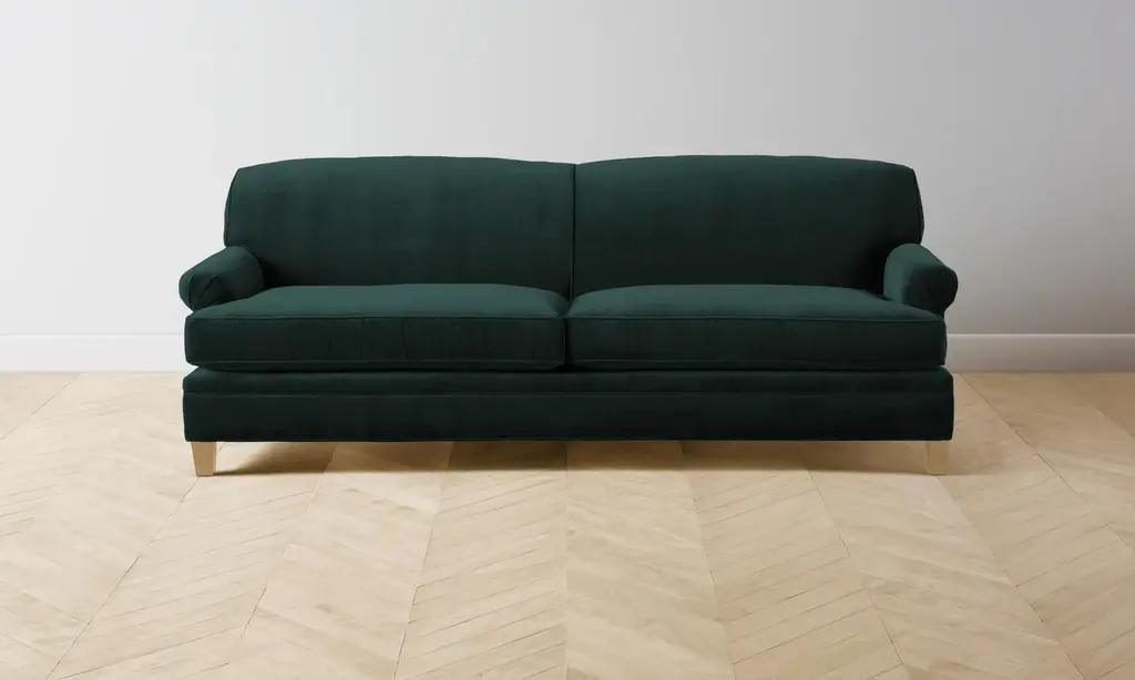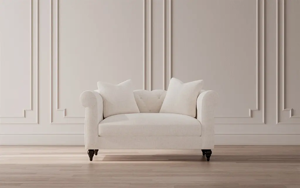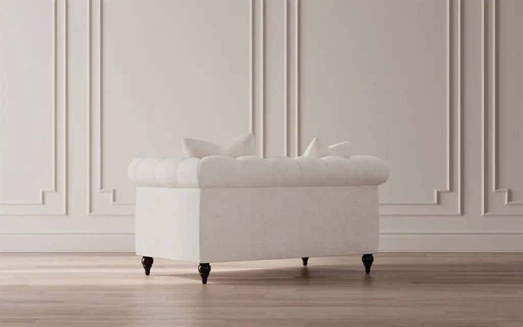 A Kathy Kuo Home exclusive, our 63” Rosehill loveseat puts a modern twist on the traditional Chesterfield style. Designed without pleating for a cleaner look, the timeless silhouette highlights rolled arms, a tufted back, and turned wood legs. A simple, sophisticated bench seat features a custom cushion fill—hypoallergenic Trillium® fiber holds its shape and offers all the comfort of down without the fluffing maintenance. This charming loveseat is a perfect choice for any classic living room.