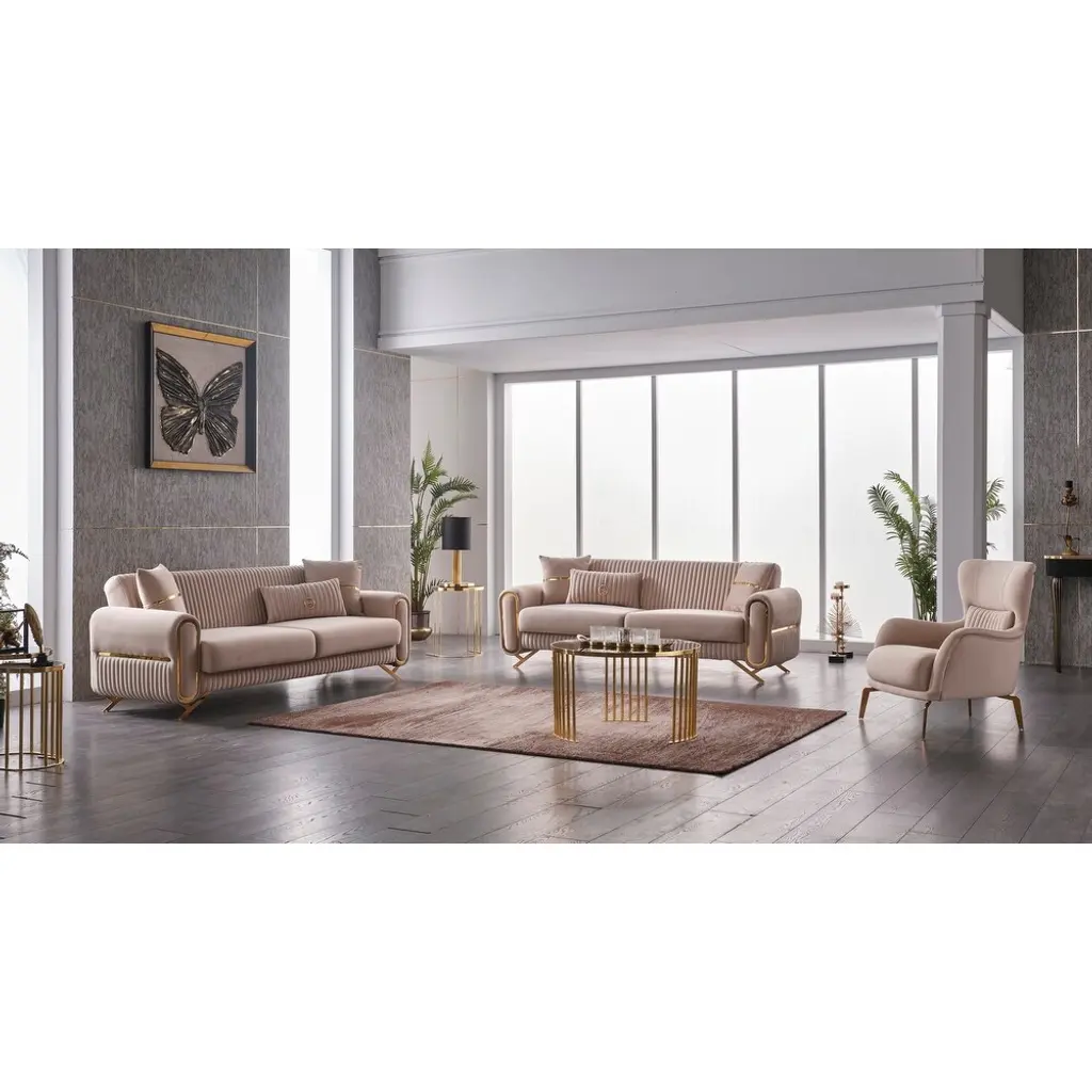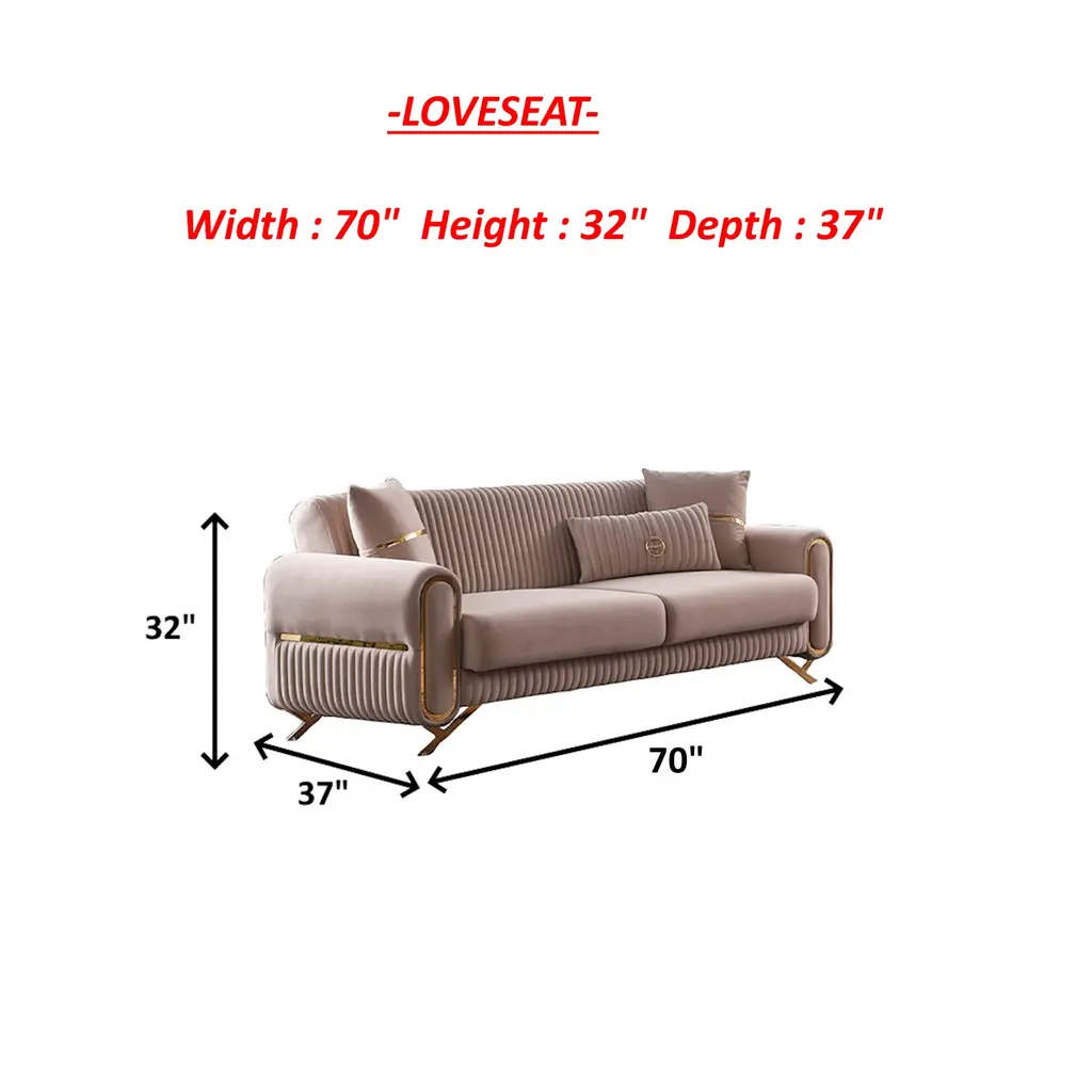 Introducing our exquisite two-seater sofa, the epitome of modern luxury and comfort. This meticulously crafted sofa is designed to exude sophistication and style, offering the option of gold or silver mirror details on its frame to suit your unique aesthetic preferences. With meticulous attention to detail, the backrest of the sofa boasts finely stitched fabric upholstery, adding a touch of texture and elegance to its overall design. Not only does the stitching enhance its visual appeal, but it also ensures durability and longevity, promising years of both comfort and style. Perched gracefully on modern and aesthetically pleasing metal legs, available in your choice of gold or silver, this sofa embodies contemporary elegance. The sleek legs feature a geometric flair, adding a modern edge to the sofa's aesthetic while providing a sturdy foundation for everyday use. Crafted from high-quality metal, the sofa ensures stability and durability, promising lasting comfort. The unique geometric design of the legs not only adds visual interest but also offers reliable support, making it an ideal choice for everyday relaxation. Furthermore, the arms of the sofa are adorned with gold or silver details, further enhancing its luxurious appeal and completing its cohesive design aesthetic. These refined accents infuse a touch of opulence and sophistication, transforming the sofa into a statement piece in any room. Combining modern elegance with exceptional comfort, our two-seater sofa sets a new standard for contemporary design excellence. Whether you're lounging with loved ones or entertaining guests, this sofa delivers the perfect blend of style and functionality, making it a standout addition to any living space. Elevate your home decor with this exquisite piece and indulge in the ultimate luxury and comfort it provides. Dimensions: • Loveseat: W: 70" H: 33" D: 37"