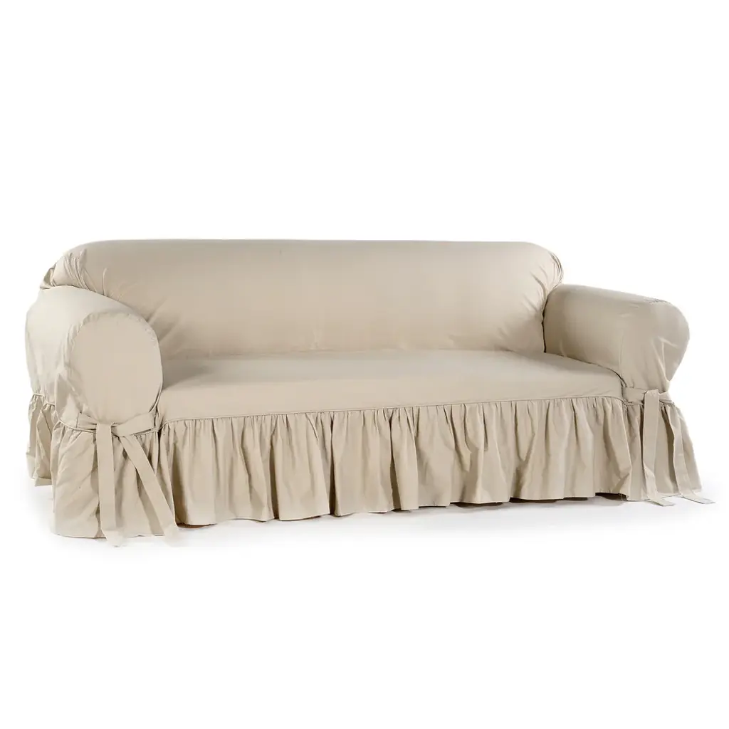 Protect your loveseat for years to come with this charming ruffled slipcover. The heavy cotton fabric ensures durability, while the side ties keep it snugly in place for a smooth and secure fit. The ruffled skirt adds an elegant flowing style and a touch of cottage charm to your living room. Choose from tea green, sea salt khaki, amy natural, or brown color options to match your decor.Features: