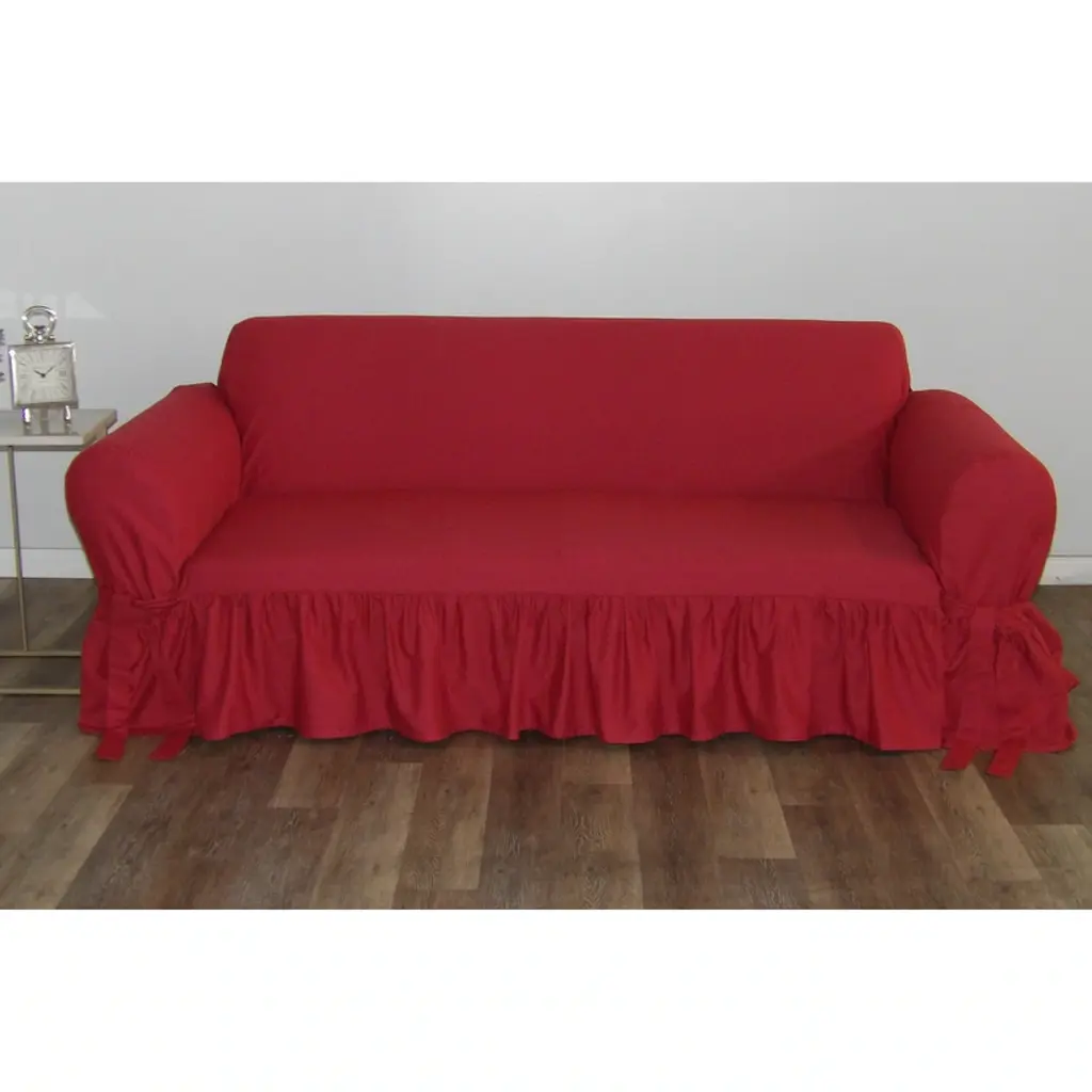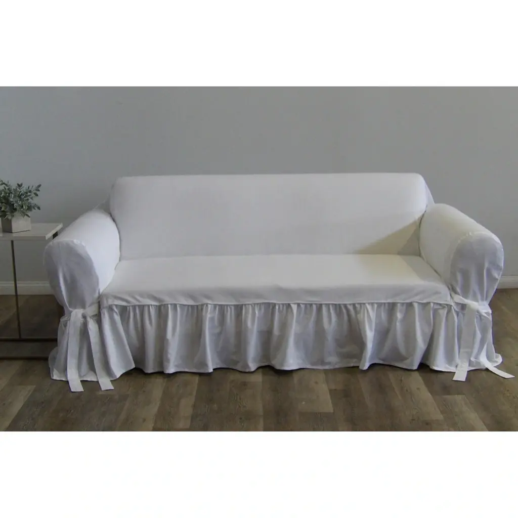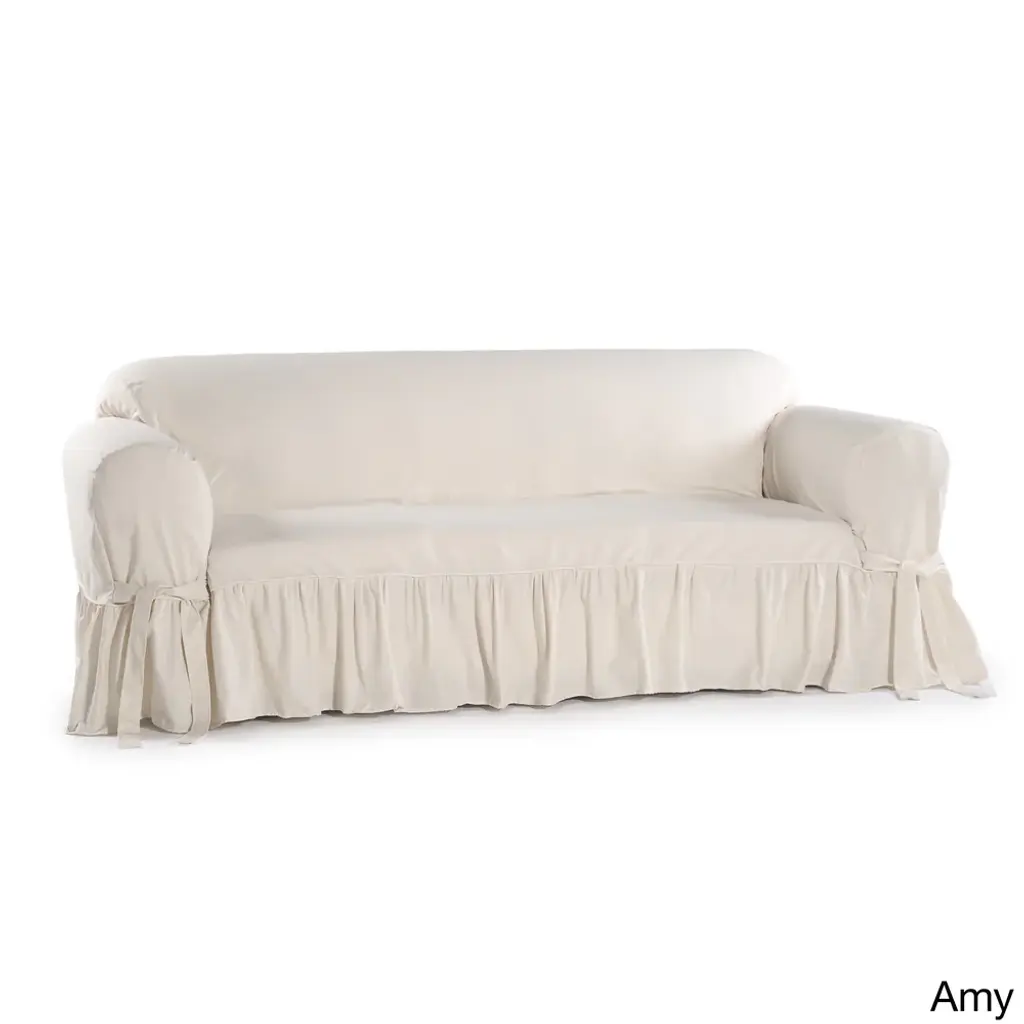 Protect your loveseat for years to come with this charming ruffled slipcover. The heavy cotton fabric ensures durability, while the side ties keep it snugly in place for a smooth and secure fit. The ruffled skirt adds an elegant flowing style and a touch of cottage charm to your living room. Choose from tea green, sea salt khaki, amy natural, or brown color options to match your decor.Features: