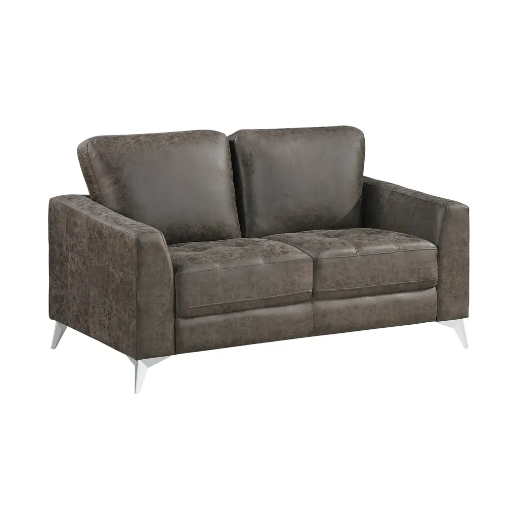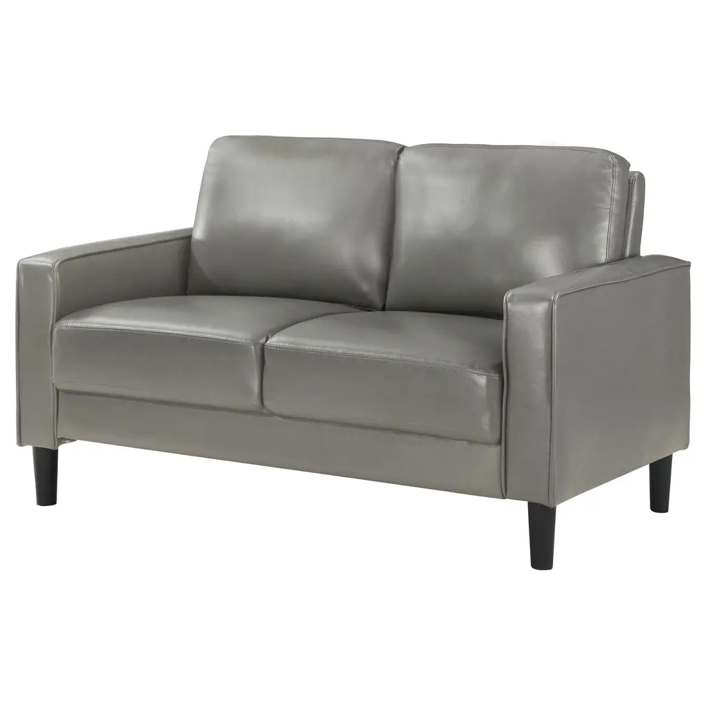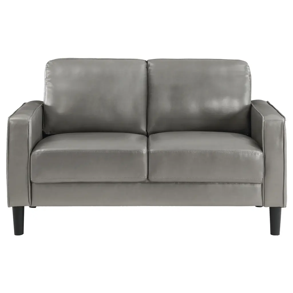 A compact profile makes this modern loveseat the perfect choice to add seating in a living room or den. It's a structured silhouette complete with track arms. Faux leather upholstery is supple and smooth, offering contemporary style and sophistication that impresses without overwhelming. Plush cushions provide wonderful comfort for lounging, with sinuous spring decking under seats and a webbed back. Tapered, straight legs offer a chic finishing touch, providing support and stability. Options: Exact Color Options: Grey and Black Item Contents: Includes: One (1) loveseat Item Bullets: Smooth, supple faux leather upholstery in a neutral hue adds a stylish look Modern look with track arms establishes a sleek loveseat silhouette for your living room or den Tapered feet provide stability and a stylish look that blends into surrounding decor Back features webbed decking and attached cushions, providing plush comfort and firm support Seats feature durable sinuous spring decking for optimal support and cushion and attached cushions Materials: Materials: Foam, Plywood, Leatherette Features: Upholstery Type: Leatherette Cleaning Code: S Weight Limit Overall: 300lbs/per seat Assembly Type: Assembly Required Dimensions: Loveseat Dimensions: 54.25 inches wide x 31.5 inches deep x 33.5 inches high Seat Dimensions: 22.5 inches wide x 21.75 inches deep x 18 inches high Accessories pictured are NOT included.