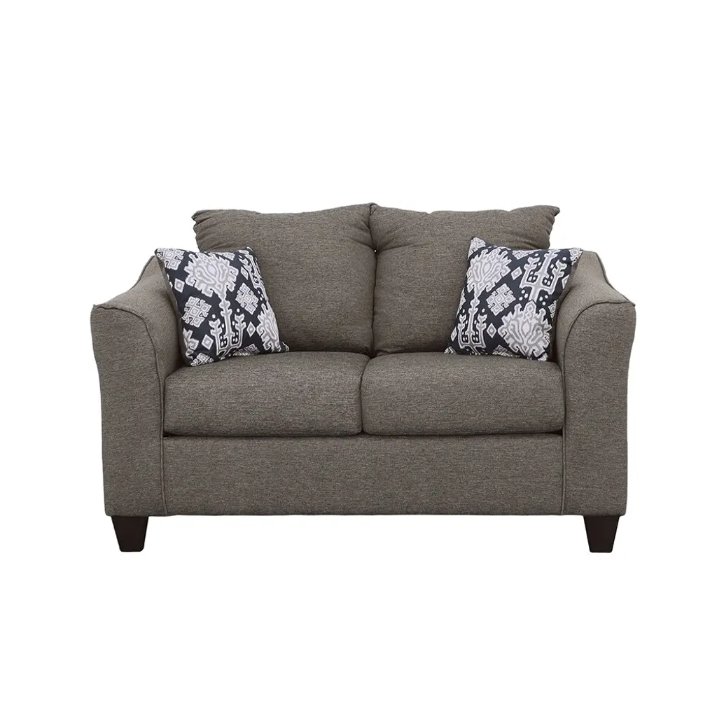 Packing a stylish punch, this modern loveseat is ideal for a compact seating area in your living room or den. Its two-seater profile features plush foam cushions for optimal comfort. The loveseat features sinuous spring decking that adds wonderful support. Upholstery is rich and updated, with accent pillows that bring both softness and casual ambiance. Arms add an appealing flared look with rounded profiling that's lovely for relaxing at home. Options: Item Contents: Item Bullets: Materials: Features: Dimensions: Accessories pictured are NOT included.
