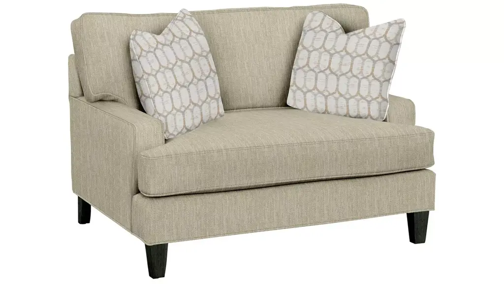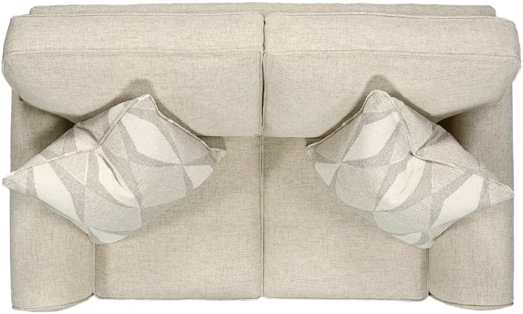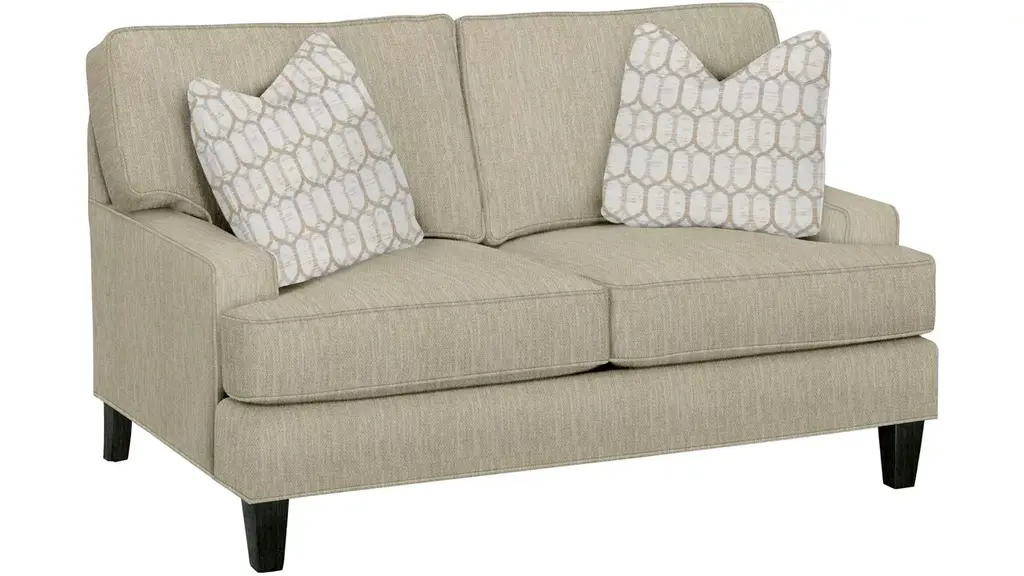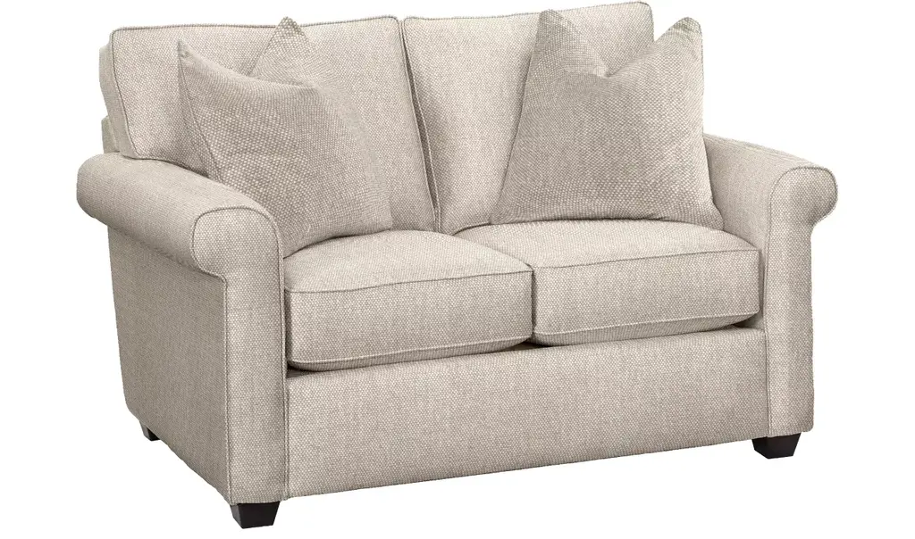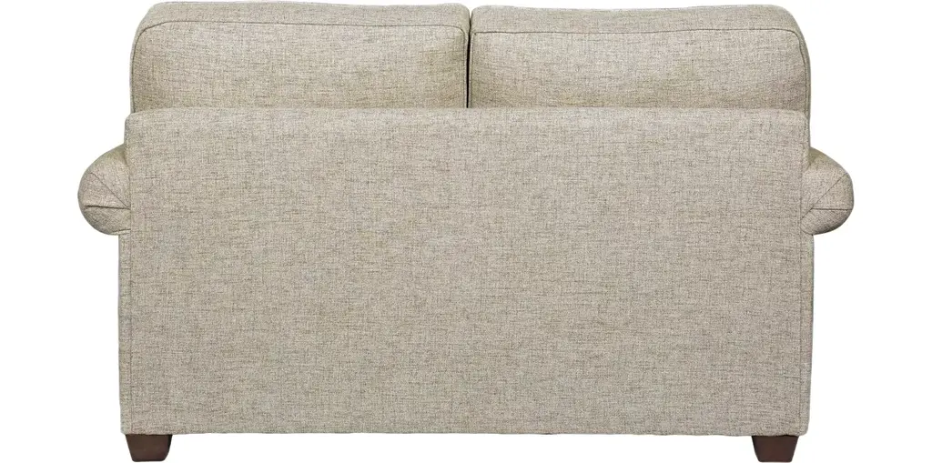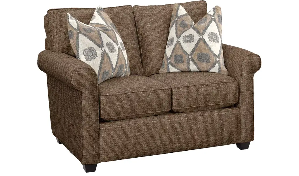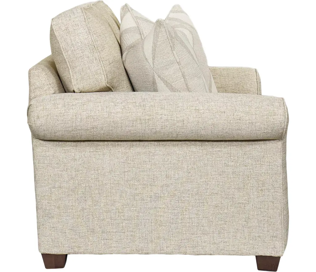 Lean into our cozy Sandy loveseat. This durable seat is supported by independent seating and the comfort of 1.8-density foam seat cushions. Its classic silhouette, padded, rolled arms, banded base and brown-finished feet create a timeless aesthetic complete with feather-filled toss pillows.
