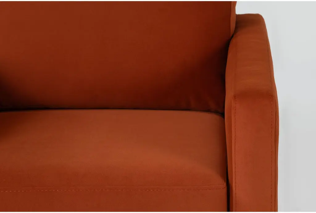The Santana Burnt Sienna Velvet Fabric Loveseat is a stylish addition to any living room with its modern design and vibrant burnt sienna color. It features comfortable cushions and supportive arms, making it perfect for relaxing after a long day. The smooth velvet fabric adds a touch of luxury and the 100% polyester ensures durability.