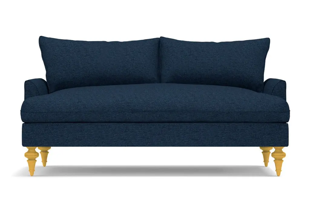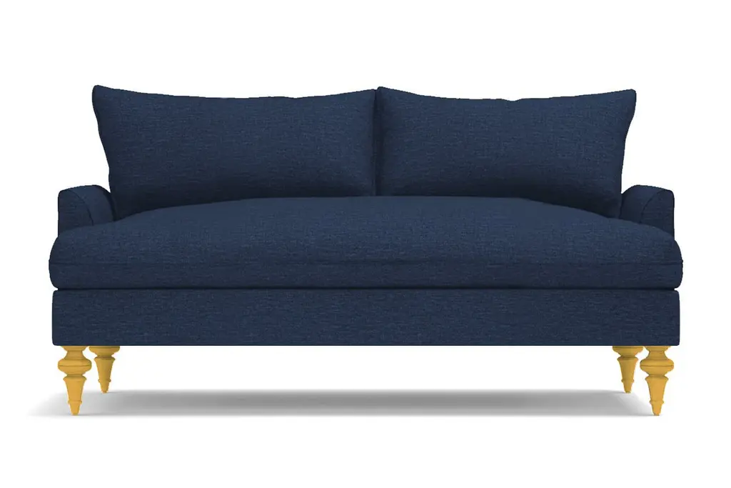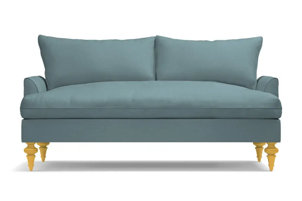 There are so many rave-worthy features on the Saxon Loveseat from Kyle Schuneman, but our favorite has to be the classic, decorative turned wood legs. For our high-heel wearing customers, the legs dress up this sofa much like heels dress up an outfit. They have the ability to elevate a simple design from same old to head-turning. Other impressive features of this transitional sofa include ultra-down plush seat cushioning and a deep bench seat for the ultimate in lounging comfort. The quality of the craftsmanship is evident throughout, and details such as knife edge trim along the seat and back cushions give it a refined, tailored finish, and the sofa is made in the USA. Choose from a range of colors that run the gamut from neutral and classy to warm and sassy.