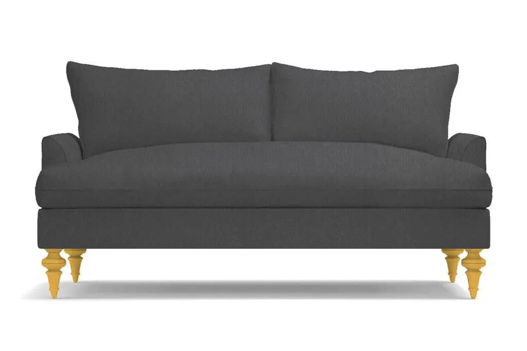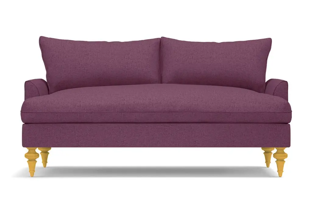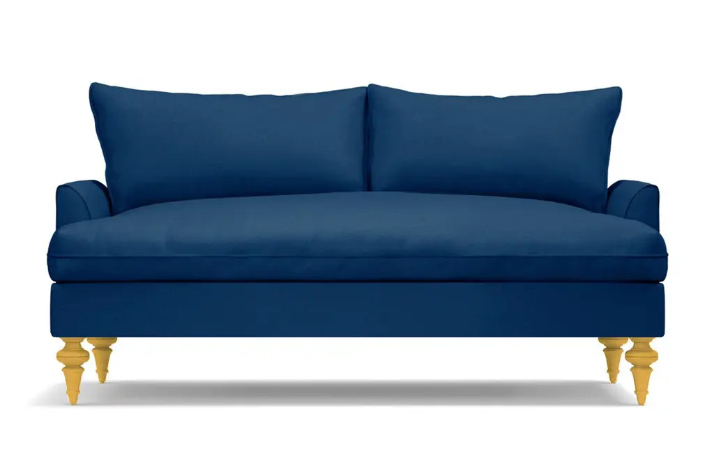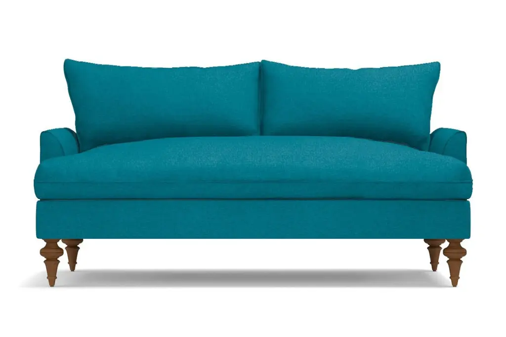 There are so many rave-worthy features on the Saxon Loveseat from Kyle Schuneman, but our favorite has to be the classic, decorative turned wood legs. For our high-heel wearing customers, the legs dress up this sofa much like heels dress up an outfit. They have the ability to elevate a simple design from same old to head-turning. Other impressive features of this transitional sofa include ultra-down plush seat cushioning and a deep bench seat for the ultimate in lounging comfort. The quality of the craftsmanship is evident throughout, and details such as knife edge trim along the seat and back cushions give it a refined, tailored finish, and the sofa is made in the USA. Choose from a range of colors that run the gamut from neutral and classy to warm and sassy.