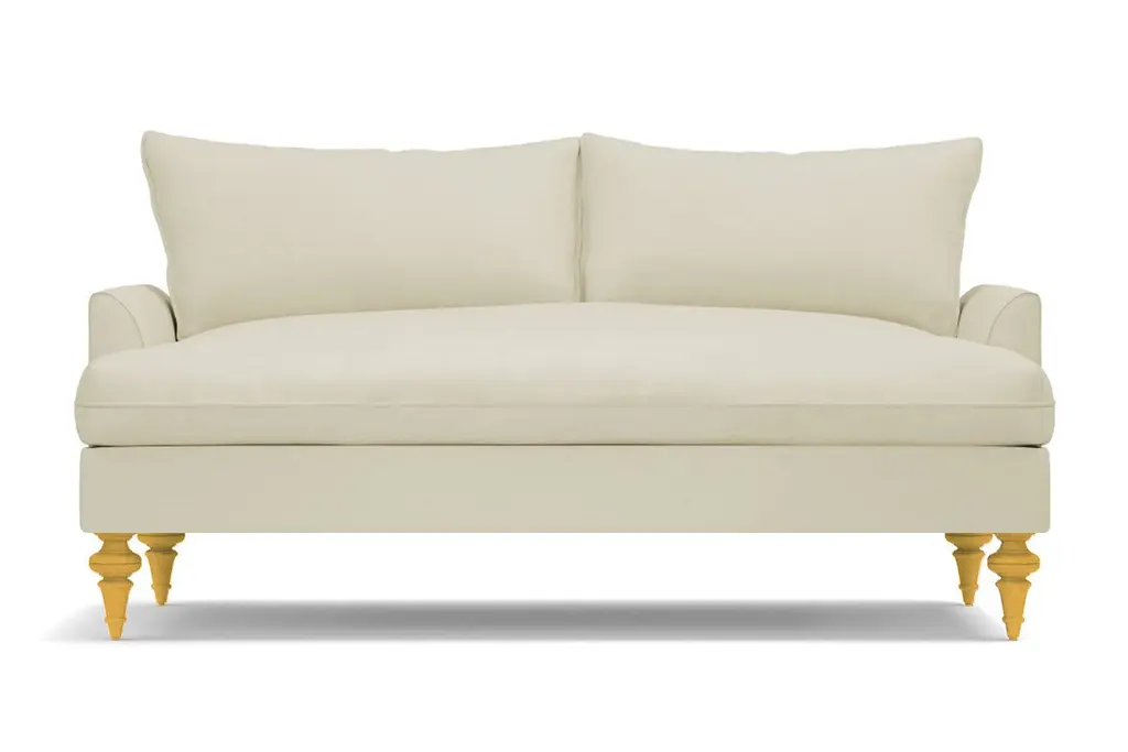 There are so many rave-worthy features on the Saxon Loveseat from Kyle Schuneman, but our favorite has to be the classic, decorative turned wood legs. For our high-heel wearing customers, the legs dress up this sofa much like heels dress up an outfit. They have the ability to elevate a simple design from same old to head-turning. Other impressive features of this transitional sofa include ultra-down plush seat cushioning and a deep bench seat for the ultimate in lounging comfort. The quality of the craftsmanship is evident throughout, and details such as knife edge trim along the seat and back cushions give it a refined, tailored finish, and the sofa is made in the USA. Choose from a range of colors that run the gamut from neutral and classy to warm and sassy.