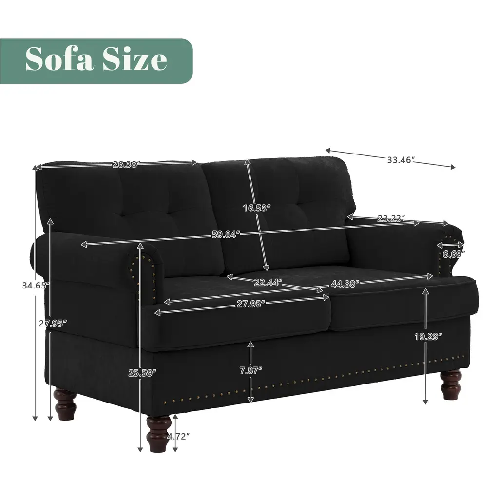The loveseat is perfect for filling living room and provides guests with enough rest. The combination of fashion and restoring ancient ways meets your aesthetic needs. Button-tufted seat back and rivet trim arms present a more classic look.Features: