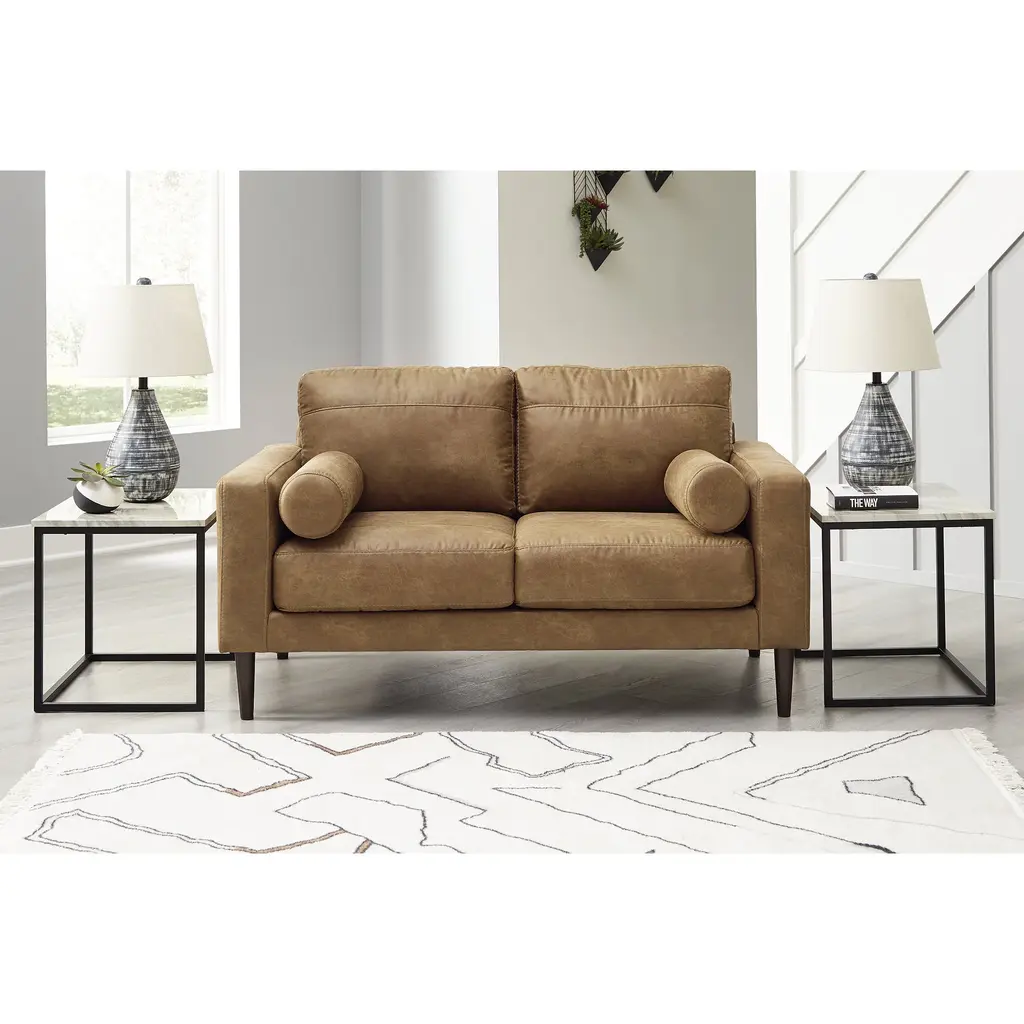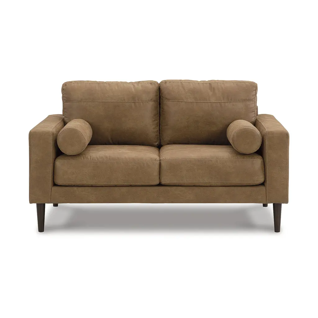 Small-scale style, tailored to perfection. This loveseat echoes retro aesthetics with warm caramel faux leather, while its ultra-linear silhouette incorporates a contemporary edge. Versatile in form and function, the seat suits styles from modern boho to transitional. And its size helps you to confidently curate your compact space without sacrificing comfort (or your budget).Features:Corner-blocked frameLoose cushionsHigh-resiliency foam cushions wrapped in thick poly fiberBolster pillows includedPillows with soft polyfillFaux leather (polyester/polyurethane) upholsteryAccent legs with faux wood finishPlatform foundation system resists sagging 3x better than spring system after 20,000 testing cycles by providing more even support