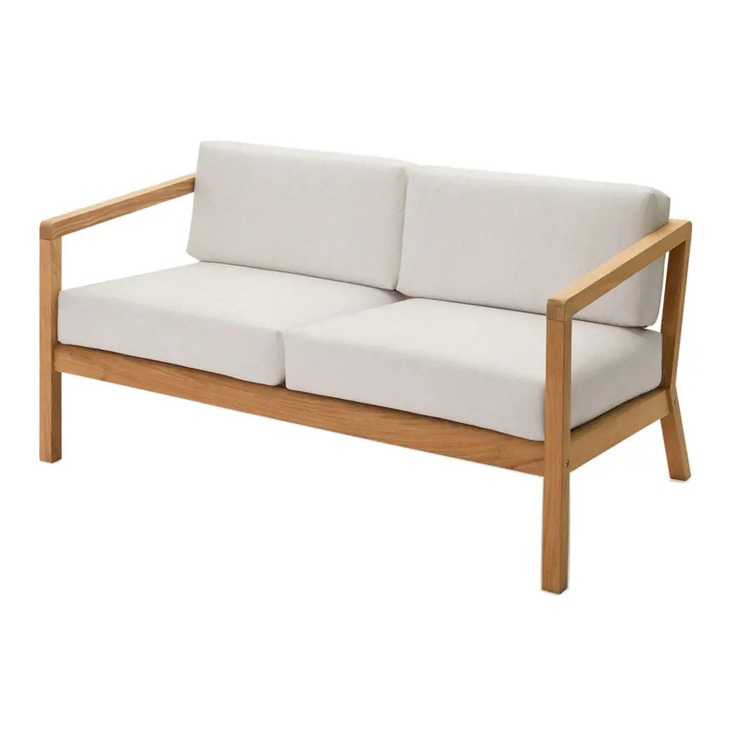 Virkelyst Sofa is a modern outdoor sofa with the seating comfort of an indoor furniture. The simple wooden frame strikes a contrast with the thick, soft cushions made in weather and water resistant Barriere textile.