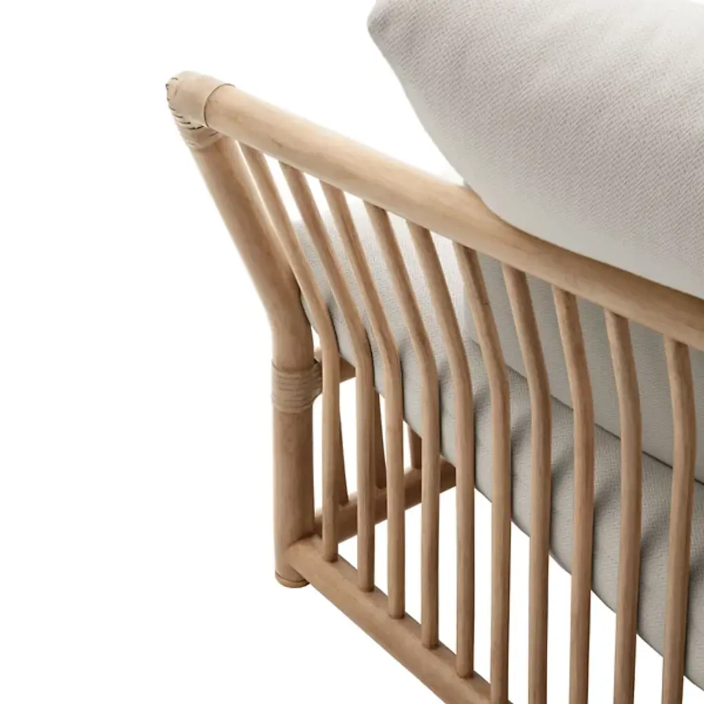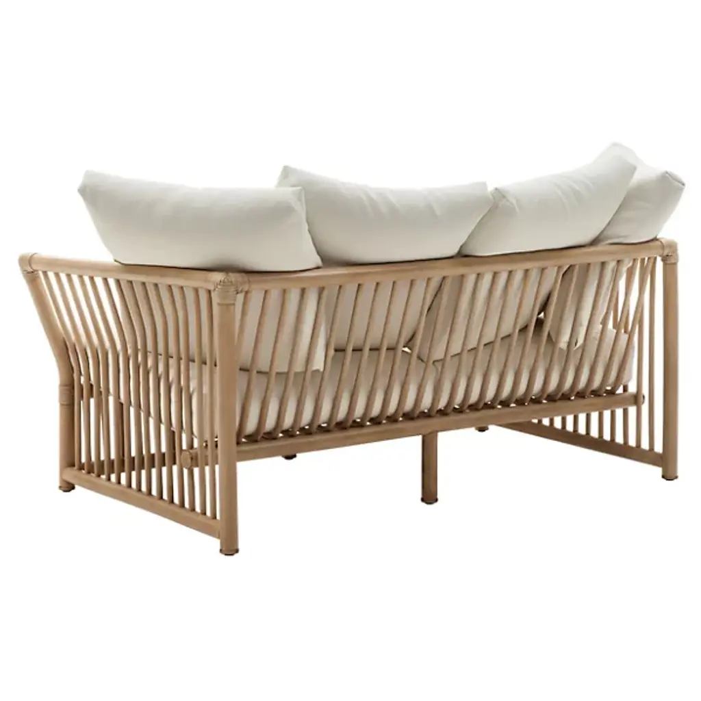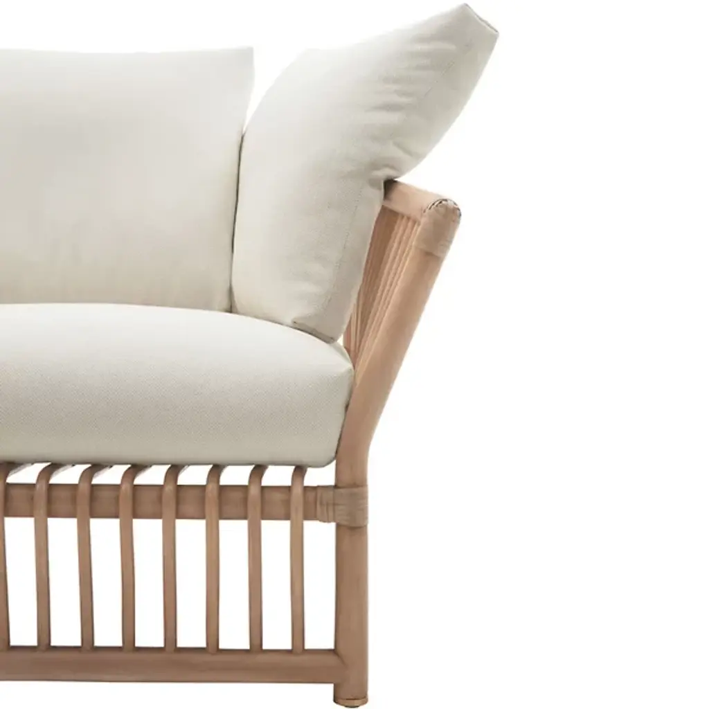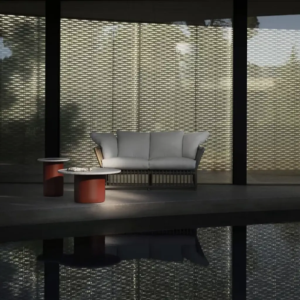 The Softcage 2-Seater Outdoor Sofa from B&B Italia puts a new spin on a classic 1975 design. Originally designed by the legendary Mario Bellini, the two-seat structure is rich with contemporary, coastal charm with a focus on ergonomic, gentle support. Its rattan frame showcases extended arms from a rectangular base, supported by brass-colored anodized aluminum legs with plastic ferrules for stability. This durable yet elegant structure is enhanced by plush cushions for superior comfort. A removable cover shields the sofa from the elements, ensuring lasting durability. This thoughtful blend of materials and design elements offers a welcoming and sensory-rich outdoor seating experience.