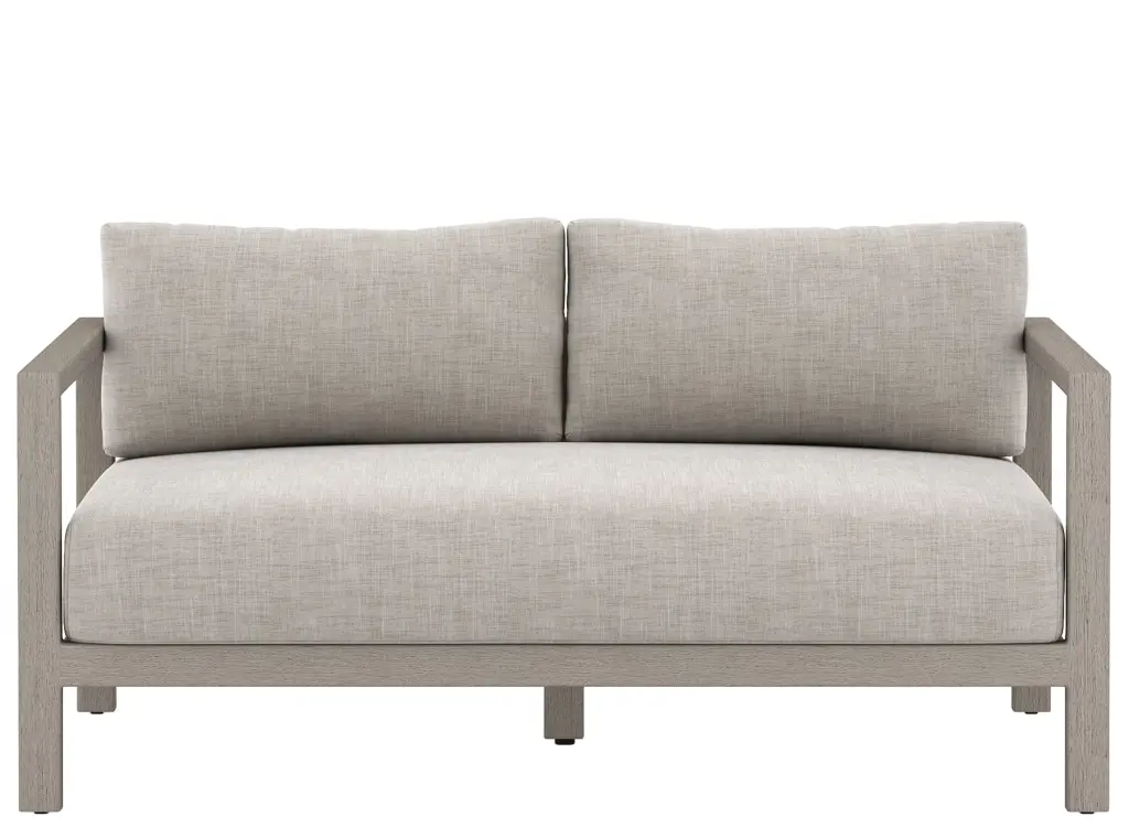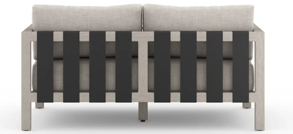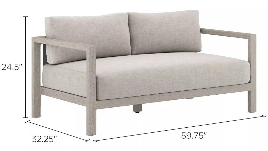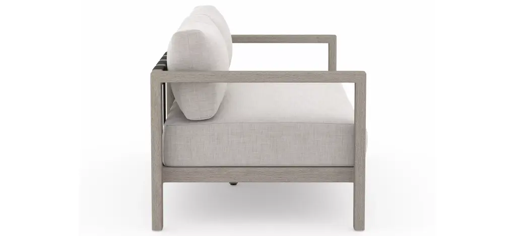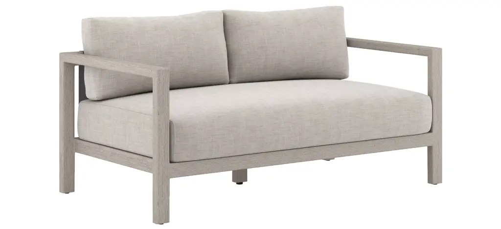 Modern materials of the Solano outdoor loveseat ready a sophisticated silhouette for the outdoors. FSC-certified teak forms a clean, wide frame for UV-resistant and water-repellent fabric. Cover or store inside during inclement weather and when not in use.