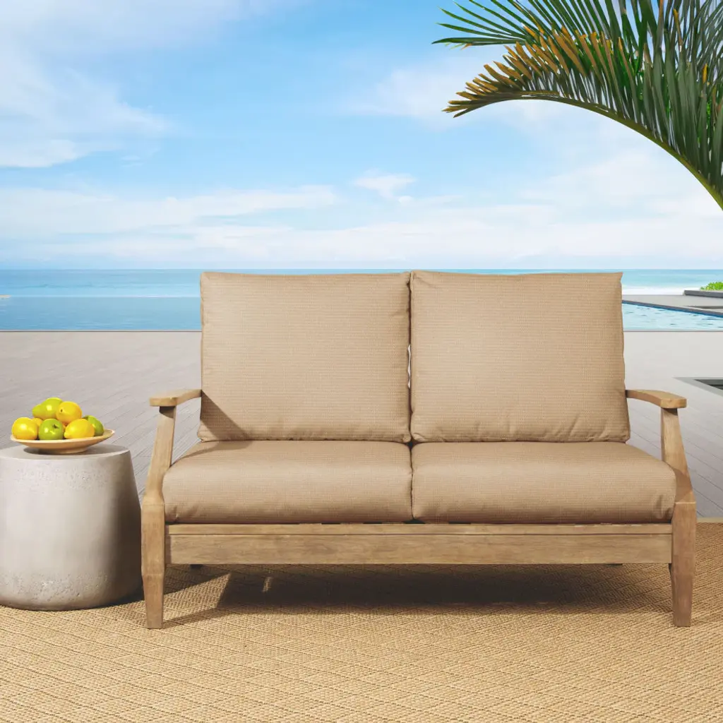 Enjoy nature with friends and family this season with the help of this luxurious loveseat cushion set! Featuring a classic solid textured fabric in a rich, tan hue, this cushion set will create the perfect setting on your porch or patio for all of your outdoor get-togethers! Crafted out of a performance material right here in North America, this loveseat cushion set is built to withstand sun, stains and all other outdoor elements. Outdura is the trusted brand for performance upholstery fabric for outdoor and indoor use.Outdura fabrics are made from 100% solution-dyed acrylic with color pigments infused to the core of fibers, ensuring colorfastness, UV resistance, and durability. • Ideal for casual indoor and outdoor use• Includes two (2) back cushions and two (2) seat cushions• Seat cushion cover can be removed for easy cleaning. Back cushion cover is not removable.• Available in a variety of sizes and colors to ensure that you find the perfect match for your furniture• Cushions only. Furniture not included.• • Made in North America•