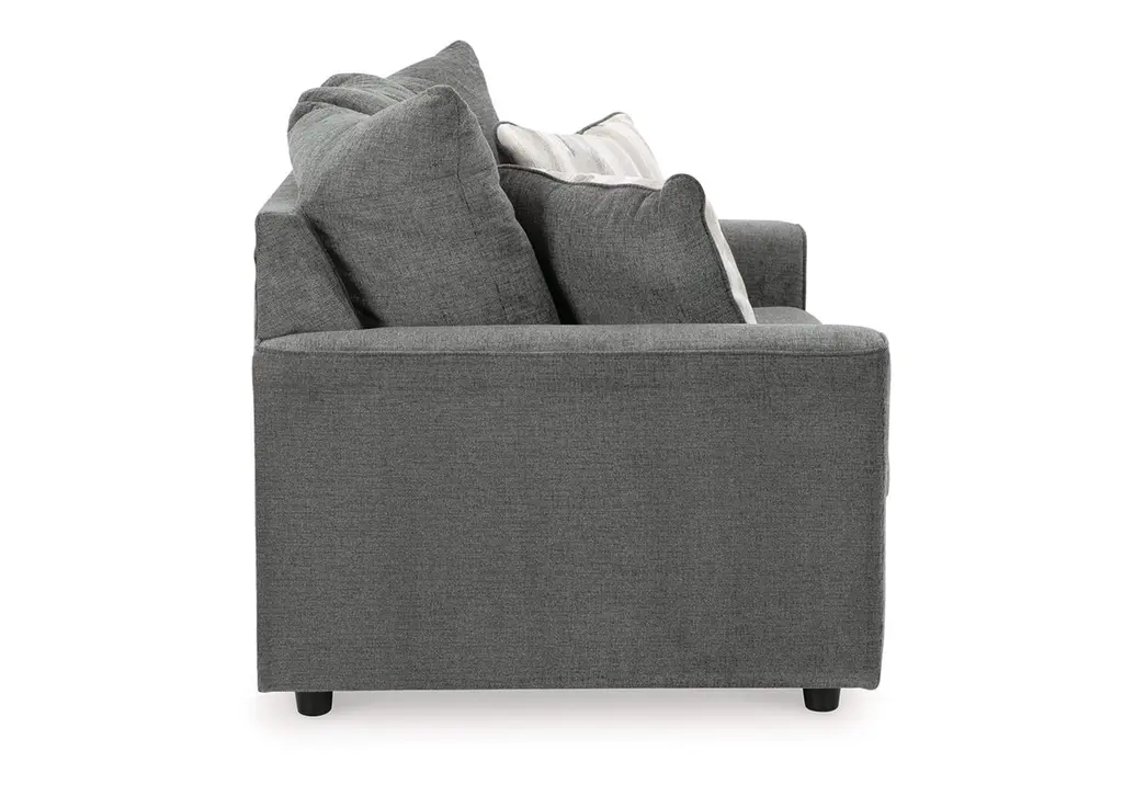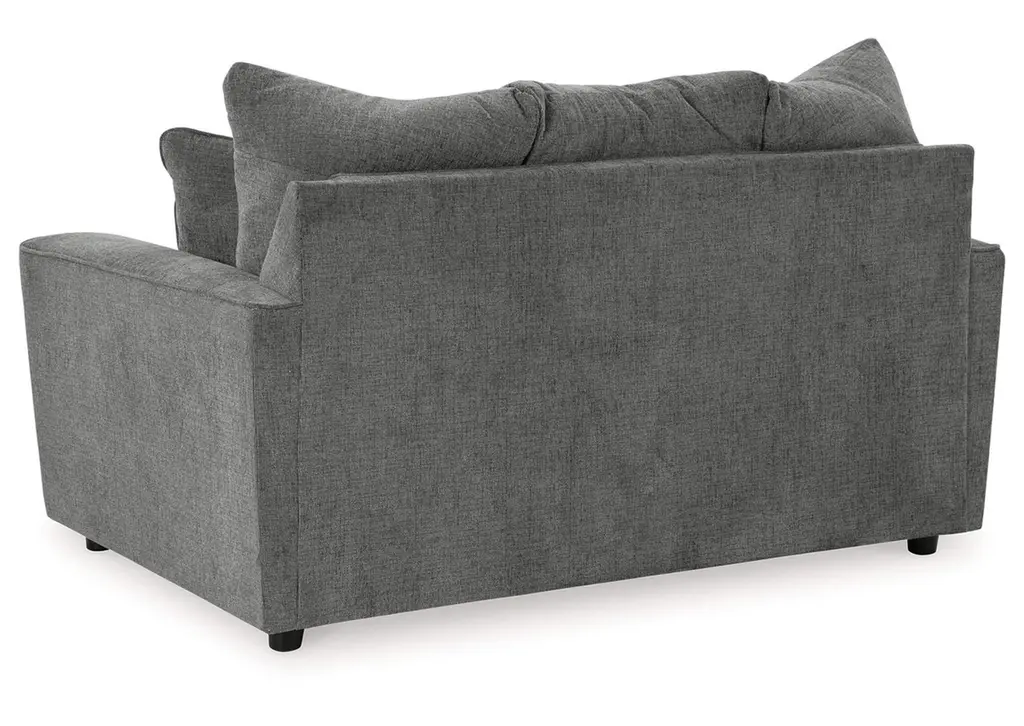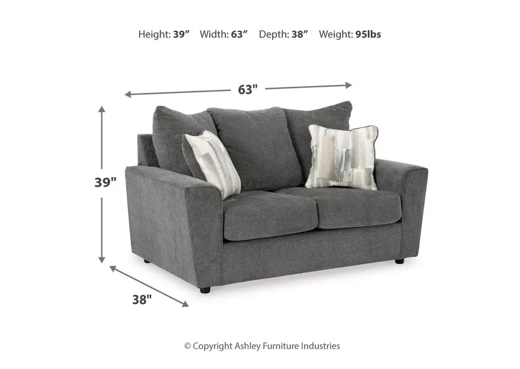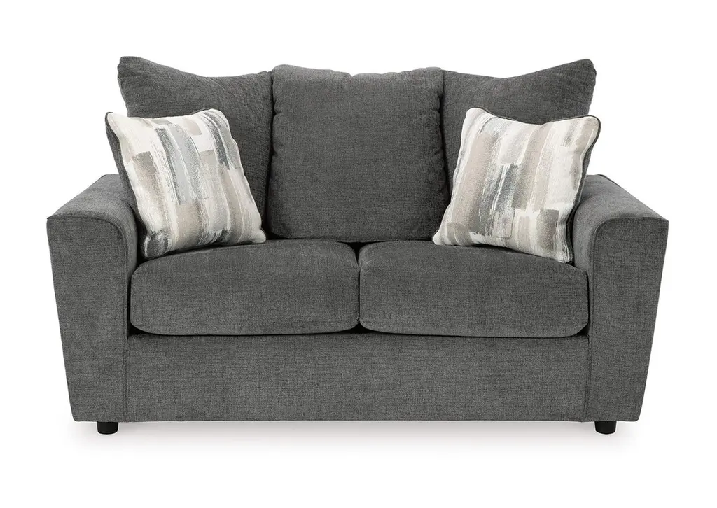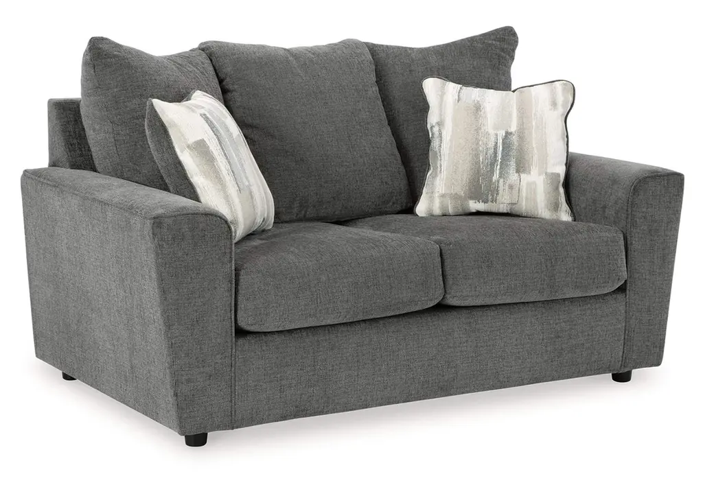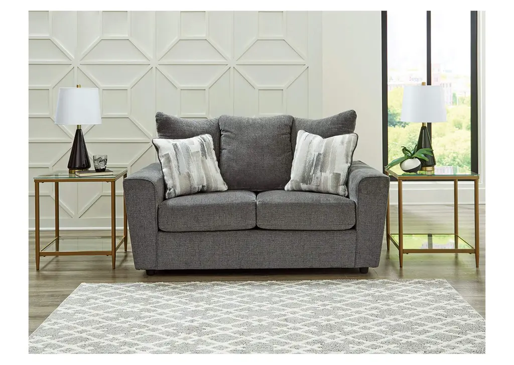 What’s new in neutrals? Shades of gray, of course. Embrace this sophisticated design trend with the gorgeous Stairatt loveseat, which offers a clean-lined, contemporary style at a comfortably cool price. Sure to lift your spirits, the plush chenille fabric is fabulously neutral. Modern flared arms give it a distinctive flair. This loveseat also arrives with two cool brushstroke accent pillows to elevate the taste and comfort level. Weight 95.000 lbs. (42.75kgs.)