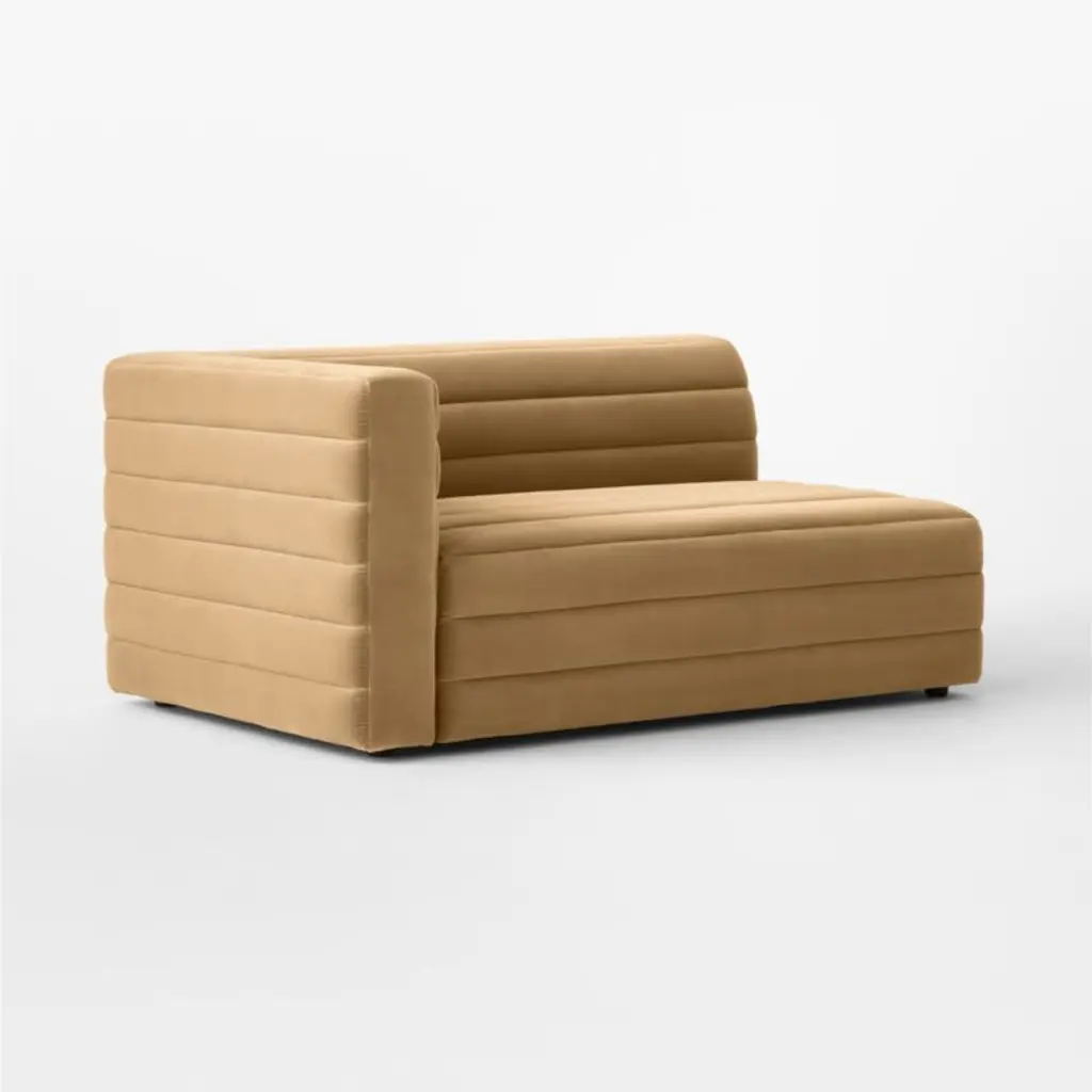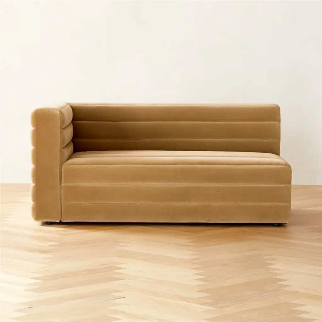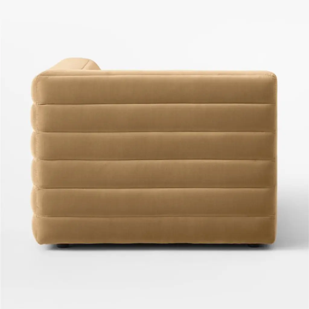 Designed by Mermelada Estudio, this vintage '70s-inspired sofa is upholstered in rich camel velvet with plush channel tufting on all sides. "Luxe" doesn't do it justice. Learn more about Mermelada Estudio on our blog. CB2 exclusive.Designed by Mermelada EstudioCotton/poly velvet upholstery in camelFSC®-certified wood frameFrame is benchmade with certified sustainable hardwood that's kiln-dried to prevent warpingClean with dry cleaning solvent only; do not use waterKeep out of direct sunlight
