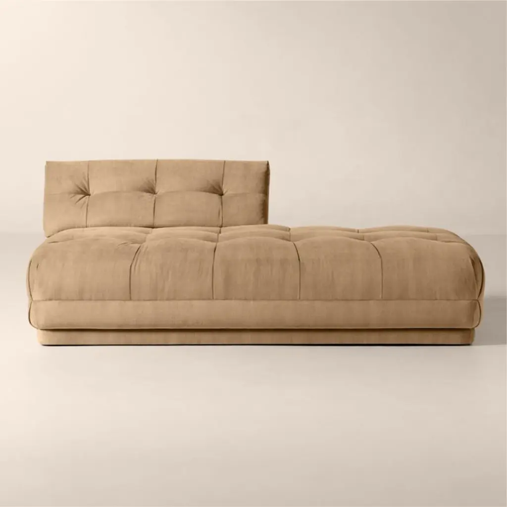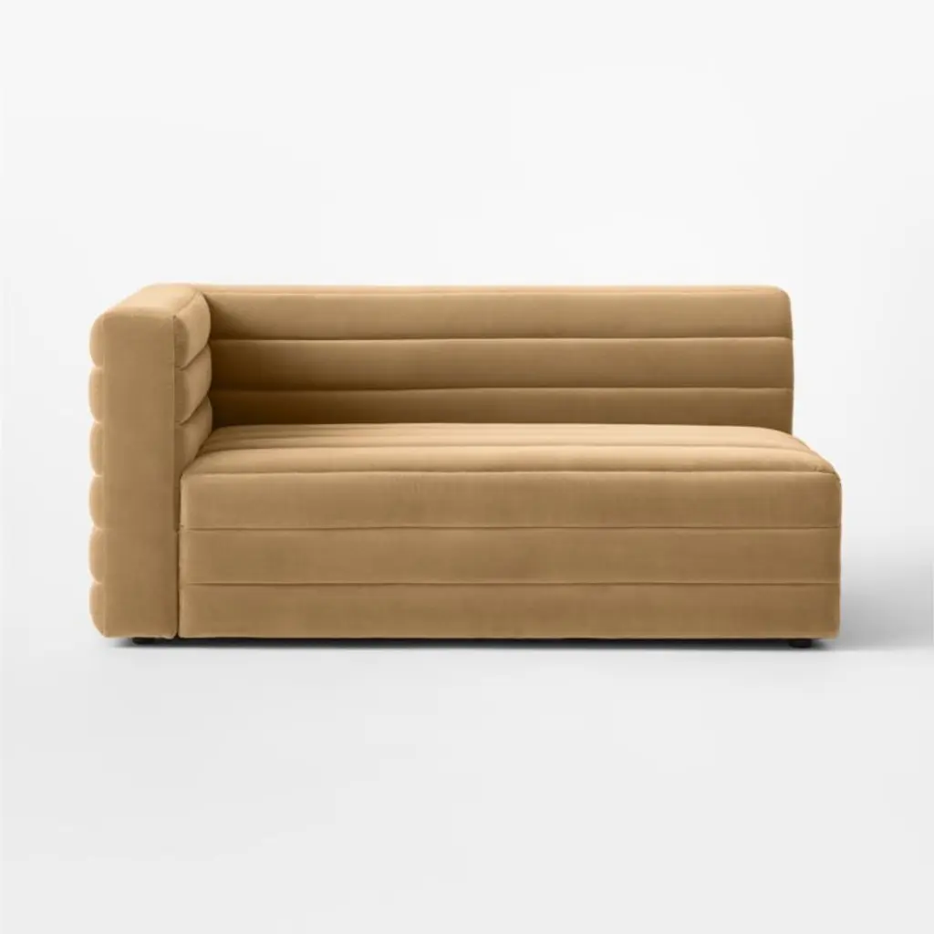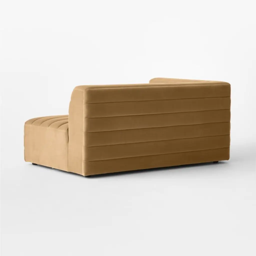 Designed by Mermelada Estudio, this vintage '70s-inspired sofa is upholstered in rich camel velvet with plush channel tufting on all sides. "Luxe" doesn't do it justice. Learn more about Mermelada Estudio on our blog. CB2 exclusive.Designed by Mermelada EstudioCotton/poly velvet upholstery in camelFSC®-certified wood frameFrame is benchmade with certified sustainable hardwood that's kiln-dried to prevent warpingClean with dry cleaning solvent only; do not use waterKeep out of direct sunlight