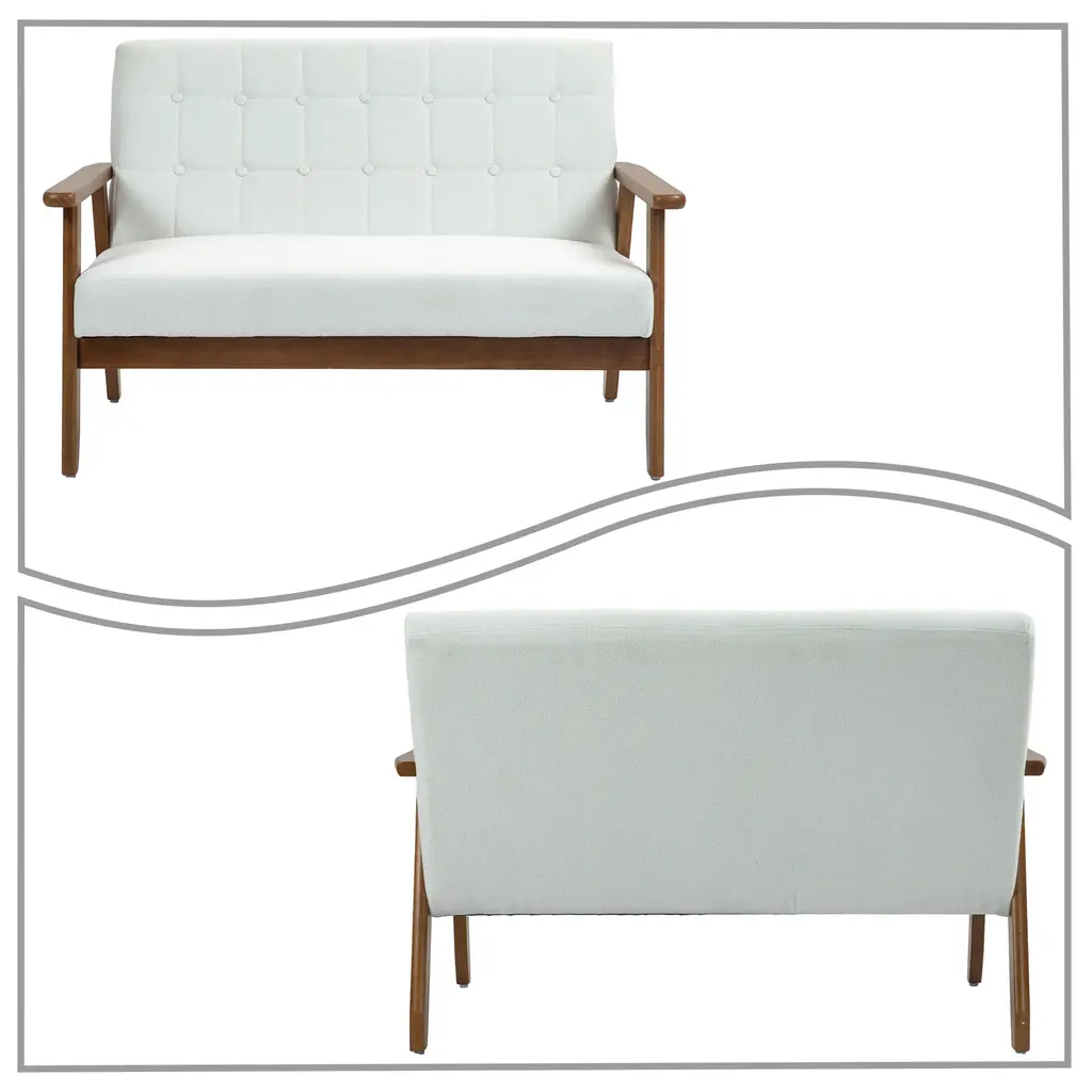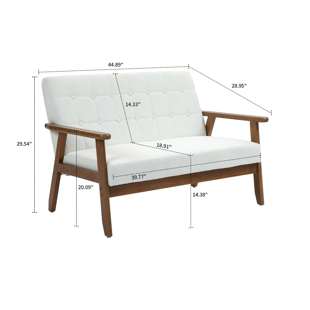 The combination of vintage design and modern comfort makes this loveseat a timeless addition to any home. This exquisite piece features a tufted button-decorated backrest, wooden armrests, frame, and legs with foot pads, all designed to bring elegance and sophistication to your living space. Ideal for small spaces, the loveseat offers comfortable seating without taking up too much room.Features: Specification: