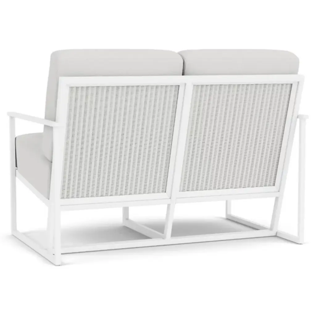 The Summit Outdoor Loveseat from Lloyd Flanders uses an engaging, angular metal construction to provide lasting outdoor comfort. Made in the USA, it features a rust-resistant aluminum frame with gently angled seating. Flat armrests provide sturdy support, while strong Lloyd Loom Wicker panels made from woven cellulose and reinforced with aluminum wire and resin add rustic texture. Soft foam cushions are wrapped in weather-resistant Sunbrella fabric, adding a resilient, layered comfort that easily endures sunlight or rain. The broad, padded seat offers plenty of space for lounging or active conversation, indoors or outside.