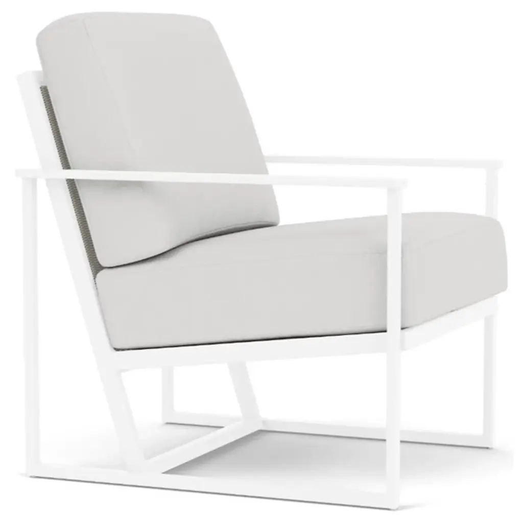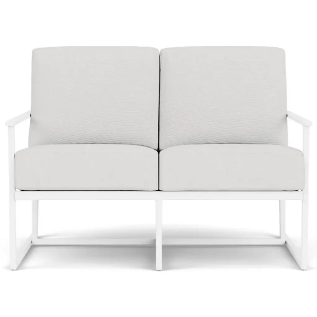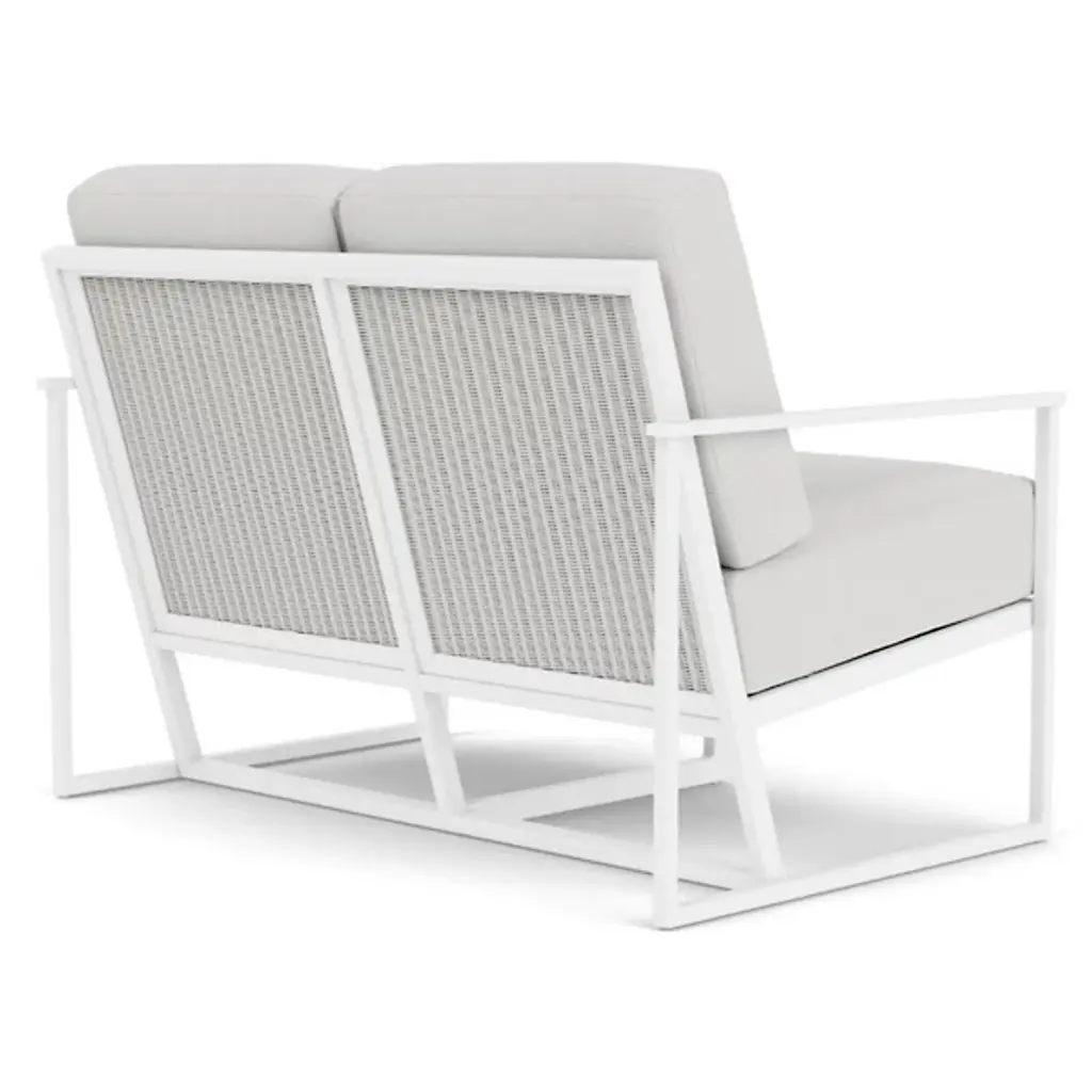 The Summit Outdoor Loveseat from Lloyd Flanders uses an engaging, angular metal construction to provide lasting outdoor comfort. Made in the USA, it features a rust-resistant aluminum frame with gently angled seating. Flat armrests provide sturdy support, while strong Lloyd Loom Wicker panels made from woven cellulose and reinforced with aluminum wire and resin add rustic texture. Soft foam cushions are wrapped in weather-resistant Sunbrella fabric, adding a resilient, layered comfort that easily endures sunlight or rain. The broad, padded seat offers plenty of space for lounging or active conversation, indoors or outside.