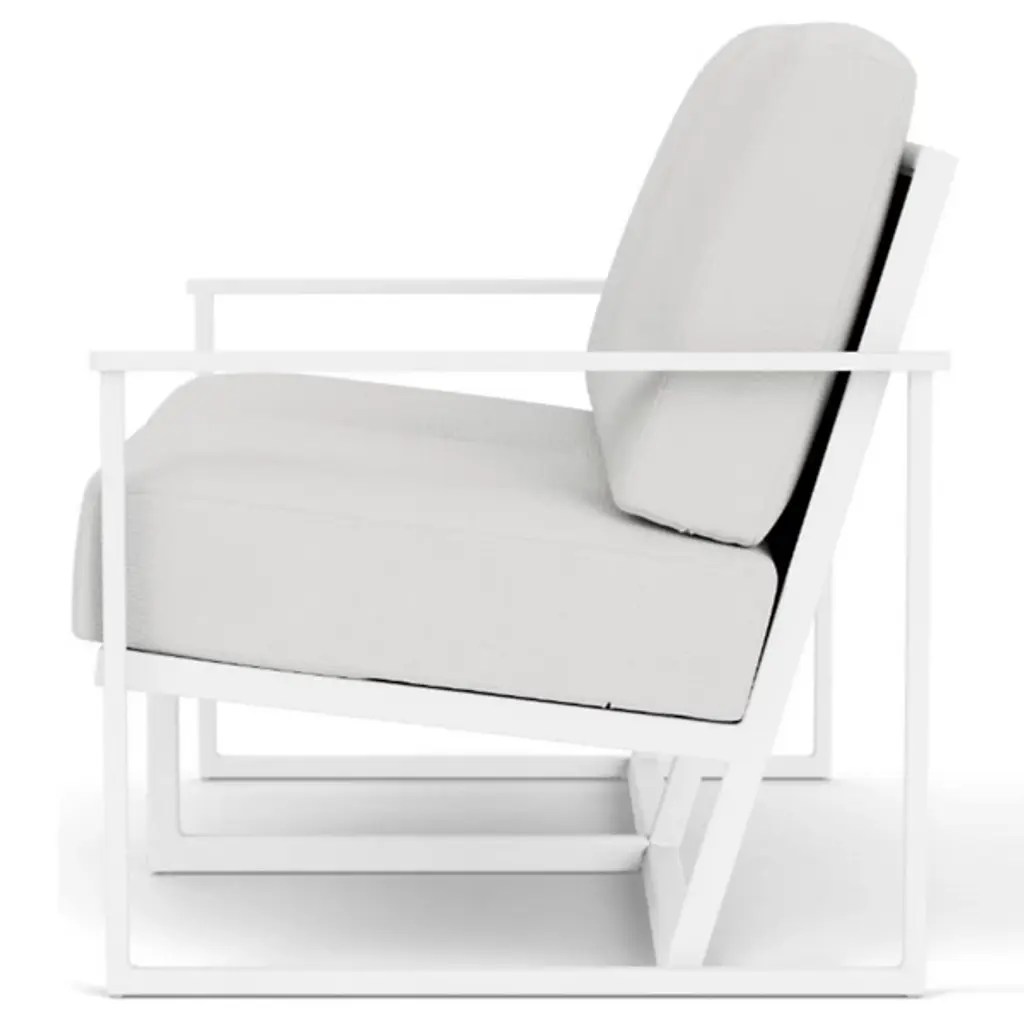 The Summit Outdoor Loveseat from Lloyd Flanders uses an engaging, angular metal construction to provide lasting outdoor comfort. Made in the USA, it features a rust-resistant aluminum frame with gently angled seating. Flat armrests provide sturdy support, while strong Lloyd Loom Wicker panels made from woven cellulose and reinforced with aluminum wire and resin add rustic texture. Soft foam cushions are wrapped in weather-resistant Sunbrella fabric, adding a resilient, layered comfort that easily endures sunlight or rain. The broad, padded seat offers plenty of space for lounging or active conversation, indoors or outside.