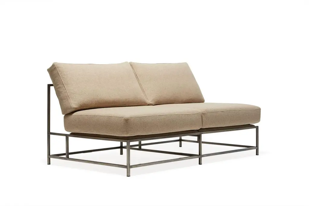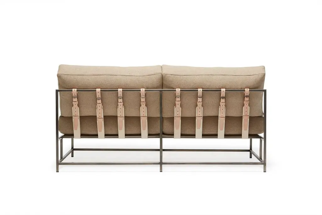 The Inheritance Loveseat by Stephen Kenn is as comfortable as it is unique. The design features an exposed construction composed of three elements - a steel frame, plush upholstery, and supportive belts. The deep seating area is perfect for a relaxing lounge experience. This loveseat comes with removable cushion covers to allow for easy cleaning should the need arise. Every Stephen Kenn piece is made to order through our Los Angeles studio in partnership with a number of small businesses and fabricators in the LA area. With this highly customizable loveseat you can select from a wide range of finishes and materials to complement your home and lifestyle - please message us to see our Customization Guide with all available options.This version of our Inheritance loveseat is upholstered in tan wool. The foam seat cushions have been wrapped in polyfiber for added softness and comfort. Sitting atop an antique nickel steel plated frame, the loveseat is strapped with support belts featuring natural cotton webbing, natural veg tan leather, and antique nickel buckles.