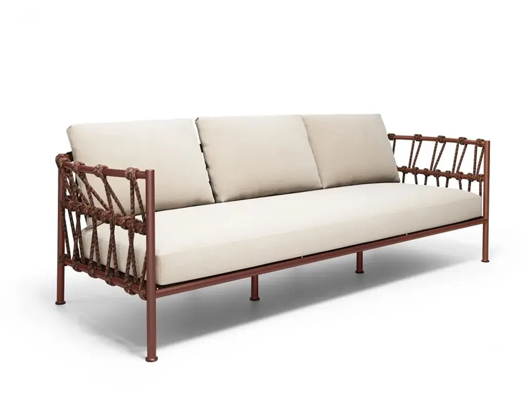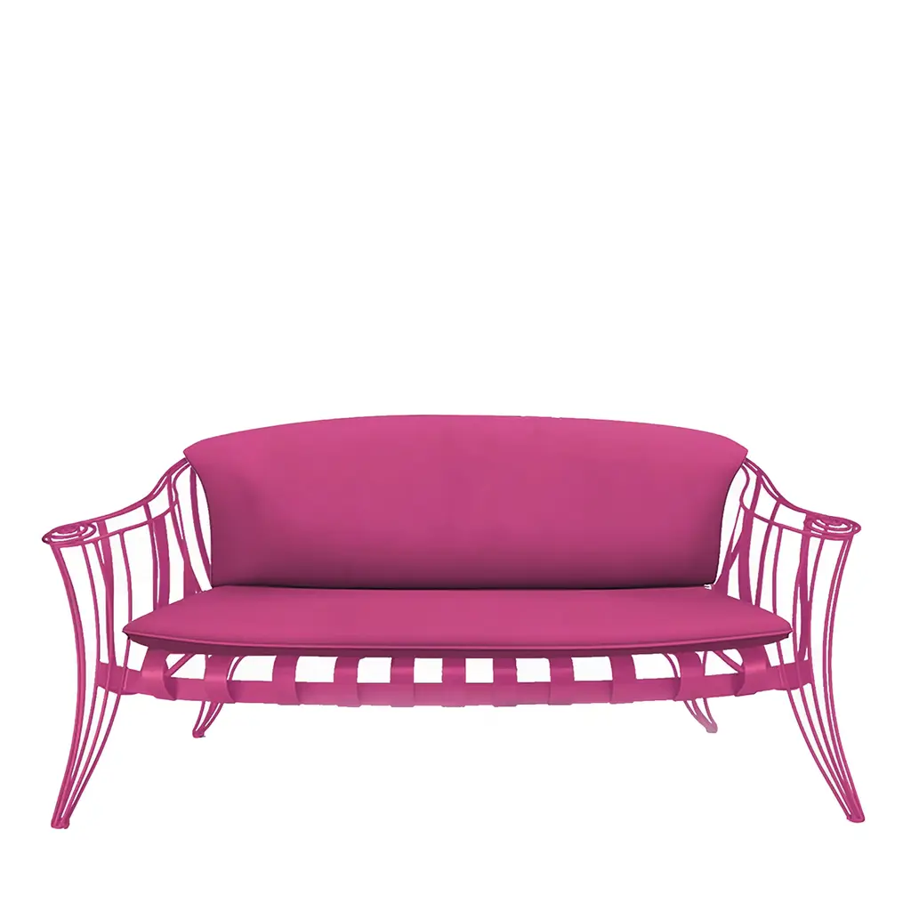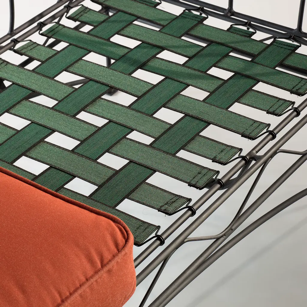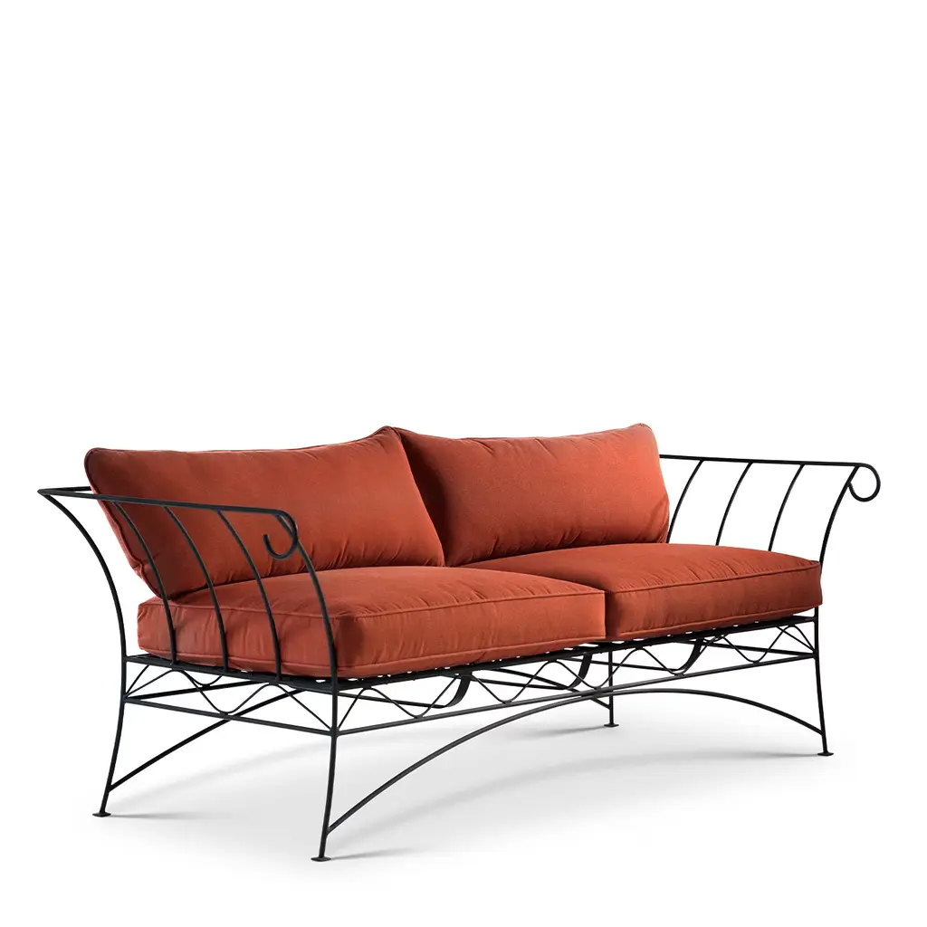 Precious addition to a terrace or garden where to spend outdoor moments of authentic relaxation in the company of a good book, this sofa stands out for its graceful frame in dark-finished steel that delights from any angle with its dynamic curves and openwork design. The plump cushions covered in a water-resistant orange fabric are sustained by a springy seat equipped with a web of belts.
