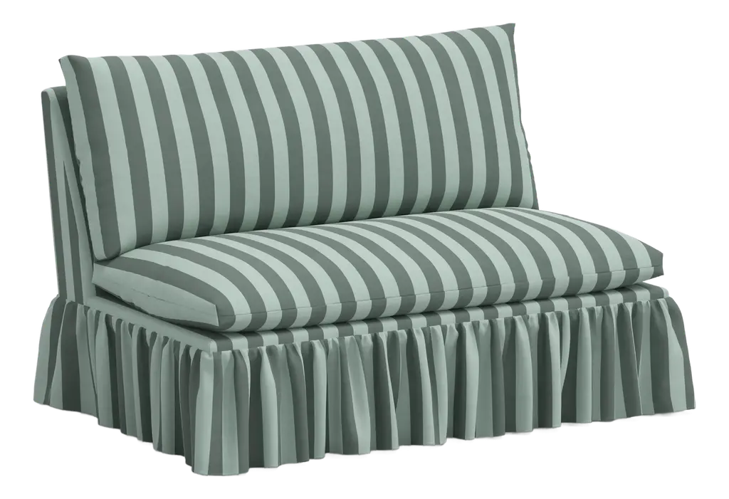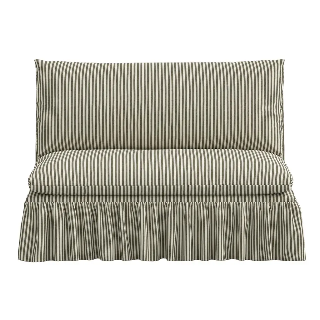 Introducing the Thelma Settee, a delightful blend of modern and vintage design that infuses a touch of cottage charm into your home. Its unique ruffled bottom sets it apart from typical contemporary furniture, adding unmistakable one-of-a-kind character to any space. Whether used as an inviting entryway bench, positioned at the edge of your bed, or as versatile seating in your living room or home office, the Thelma Settee promises to breathe fresh life into your decor. With its timeless appeal and versatile functionality, it's sure to become a beloved focal point in your home. Exclusively available from the Stoffer Home crafted by Cloth & Company collection.