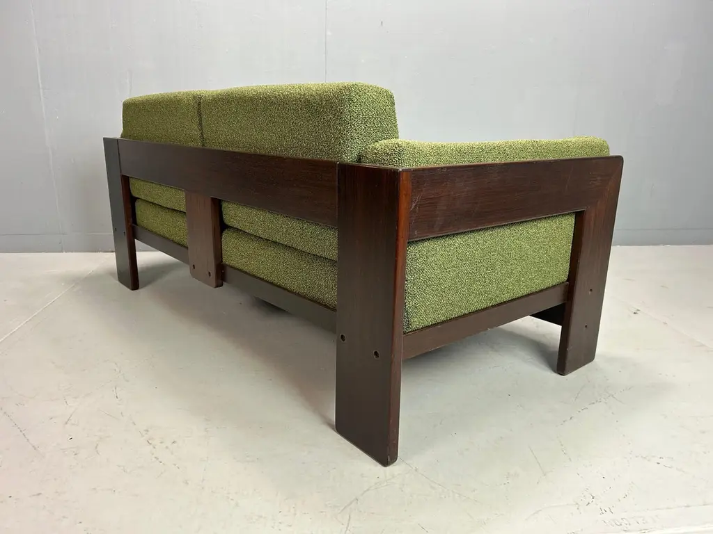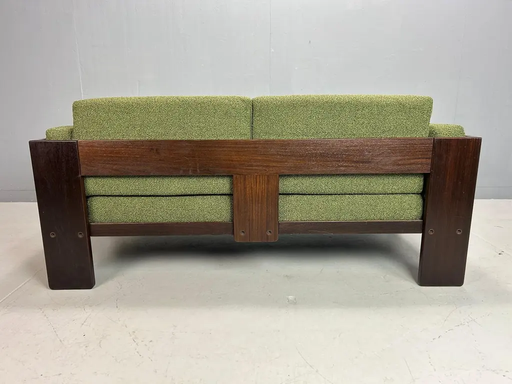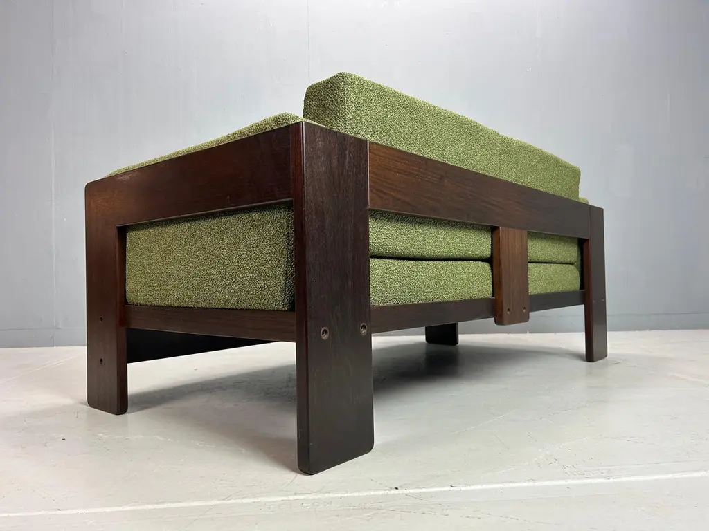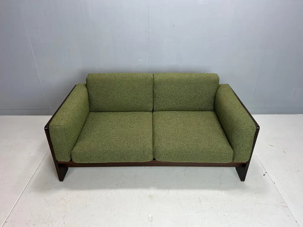 Two-seater sofa was produced by Knool in 1960s and designed by Tobia Scarpa.Mid-Century Modern period Italian design item.Tobia Scarpa designed the Bastiano series for the experimental design laboratory of Gavina in 1960. About the result Gavina said it "exploited Le Corbusier's idea of free cushions in order to make a modern sofa" this time in wood. The sofa is very comfortable as it has thick cushions that fall into the frame. The frame therefore functions as a basket that holds the thick, comfortable cushions together. Solid Wenge supporting frame.The cushions have been reupholsterd and the foam has been replaced.
