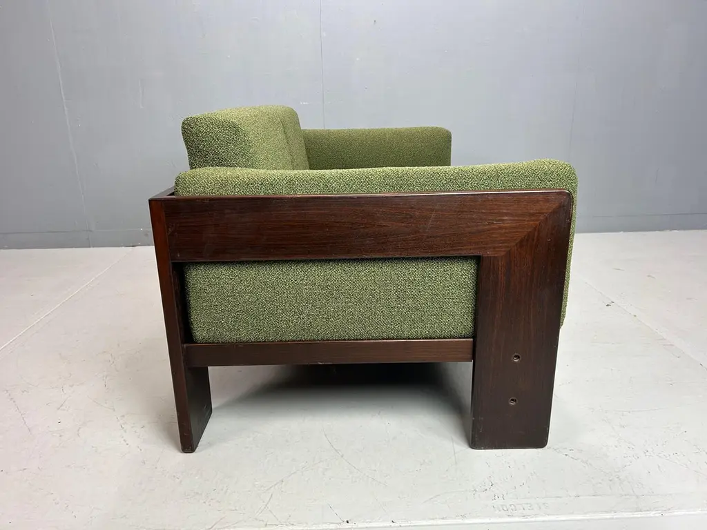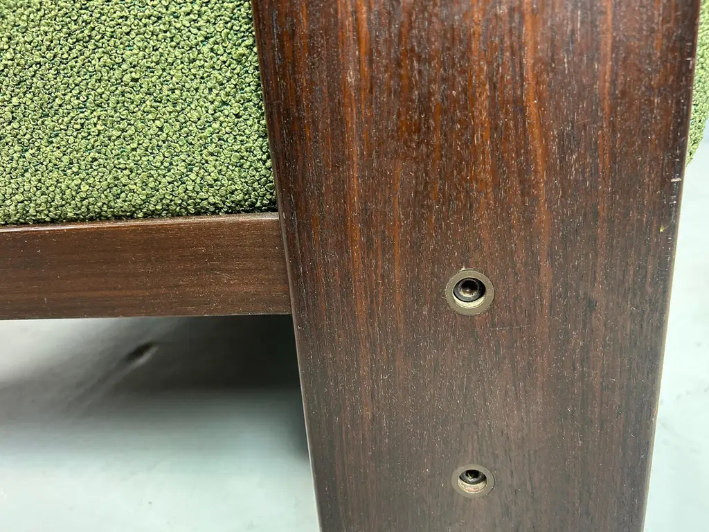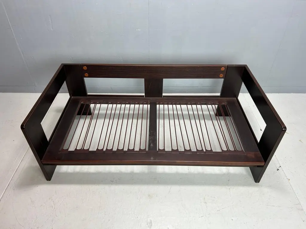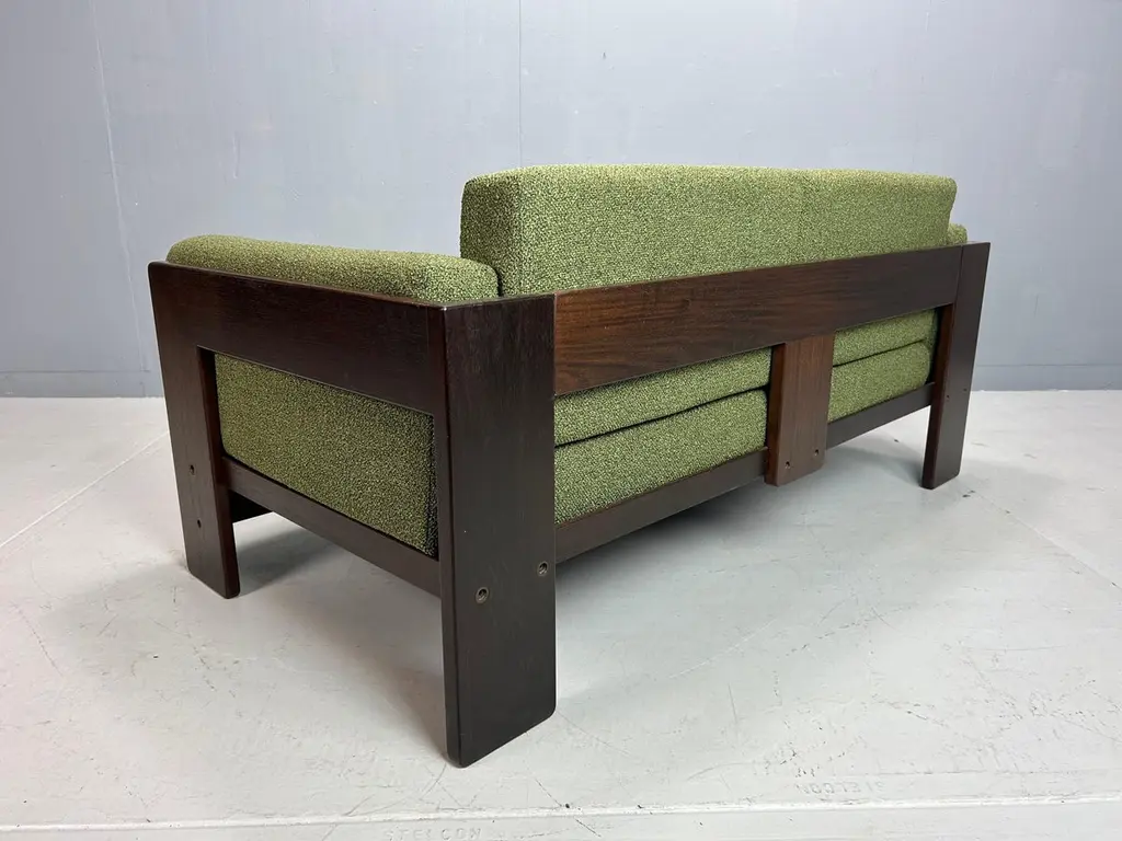 Two-seater sofa was produced by Knool in 1960s and designed by Tobia Scarpa.Mid-Century Modern period Italian design item.Tobia Scarpa designed the Bastiano series for the experimental design laboratory of Gavina in 1960. About the result Gavina said it "exploited Le Corbusier's idea of free cushions in order to make a modern sofa" this time in wood. The sofa is very comfortable as it has thick cushions that fall into the frame. The frame therefore functions as a basket that holds the thick, comfortable cushions together. Solid Wenge supporting frame.The cushions have been reupholsterd and the foam has been replaced.