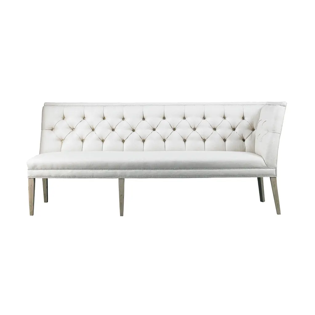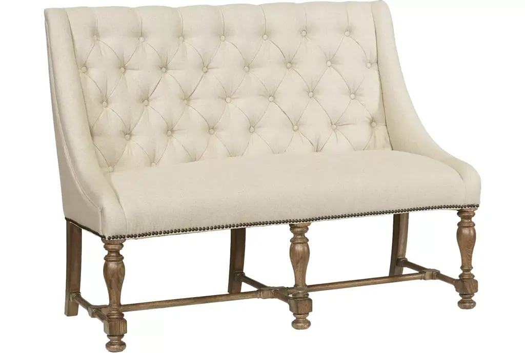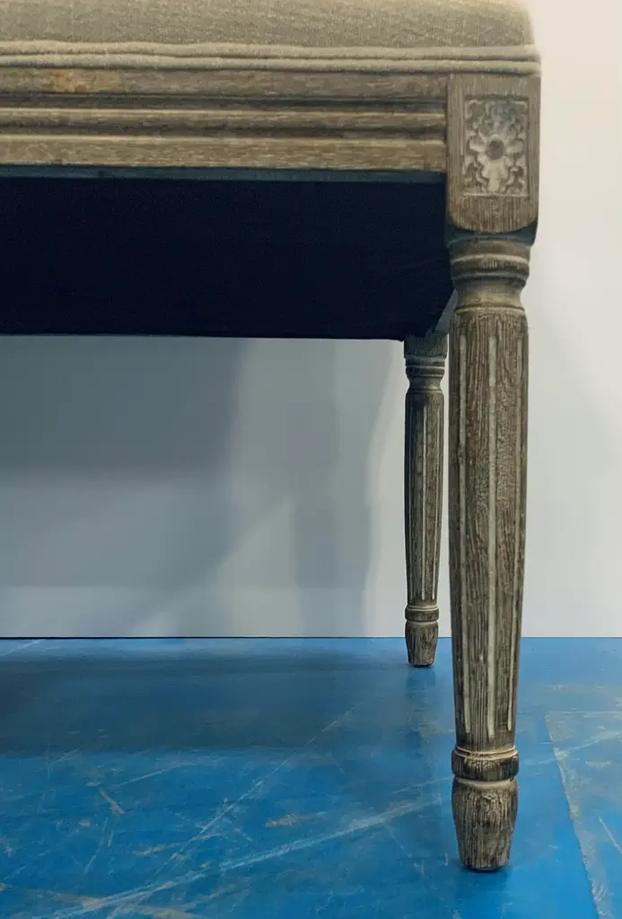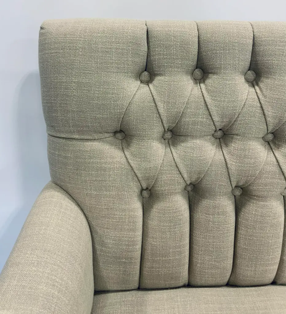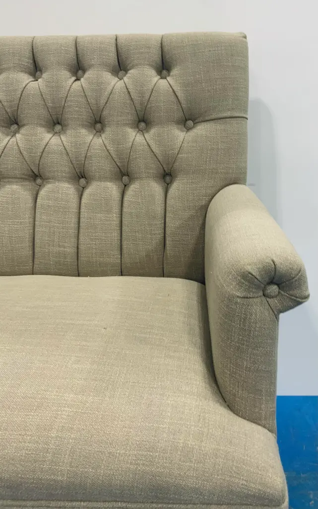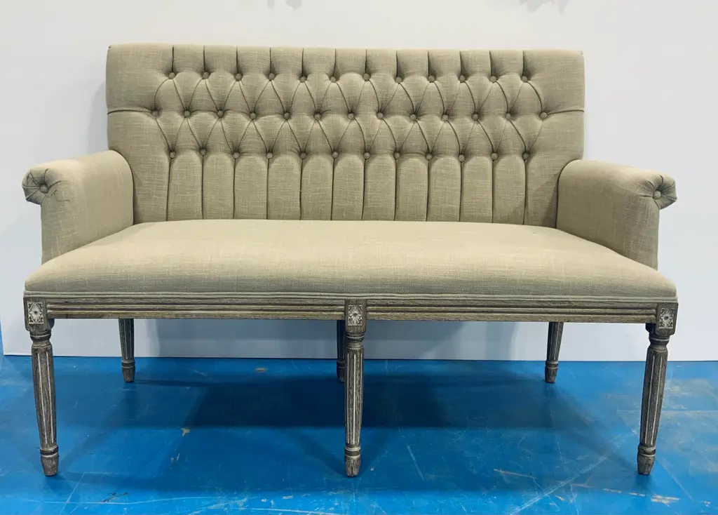 Timeless Transitional Linen Blend Gray Tufted Medium Settee, monochromatic fluted wood legs with carved rosette medallion detail, showroom floor sample
