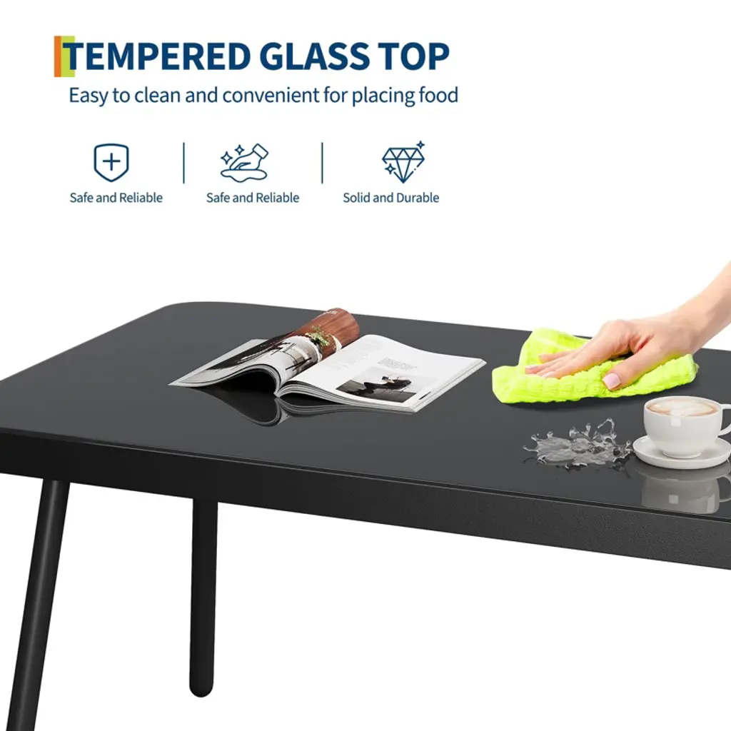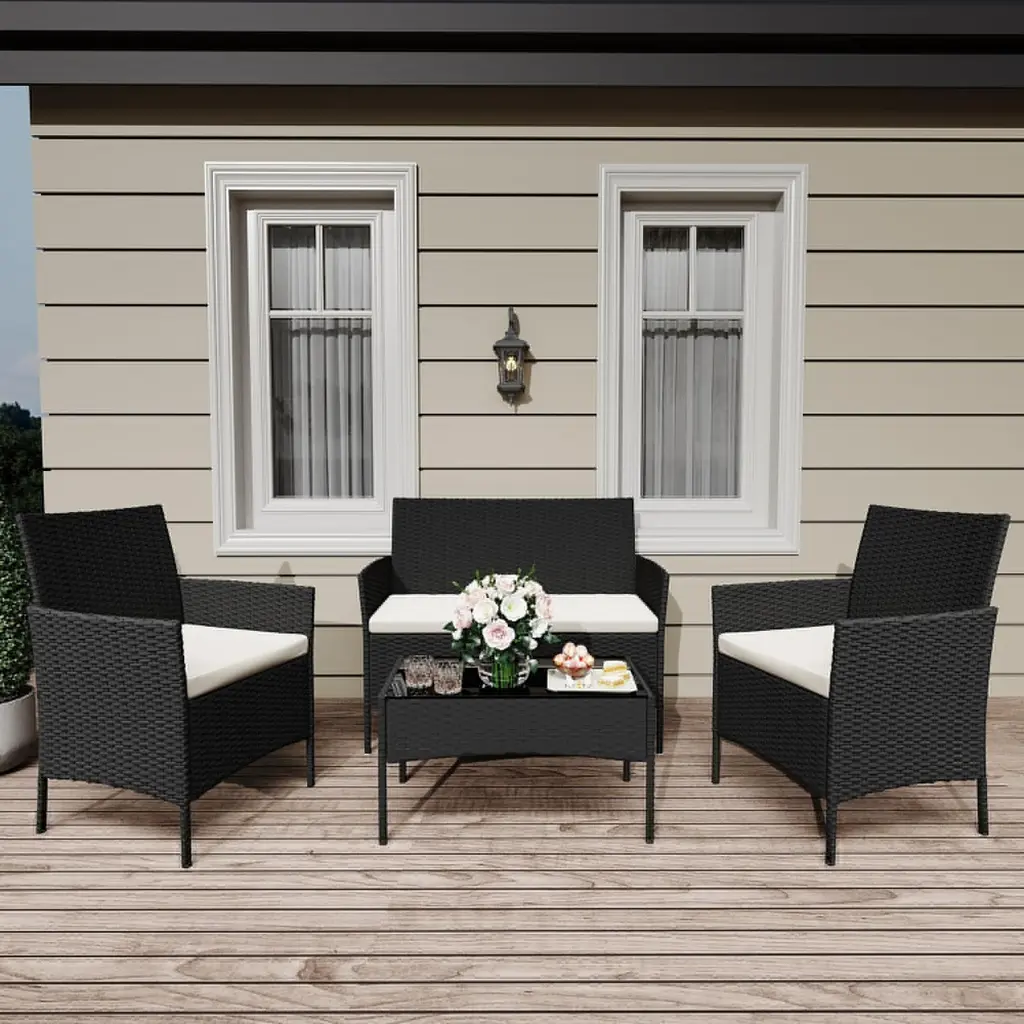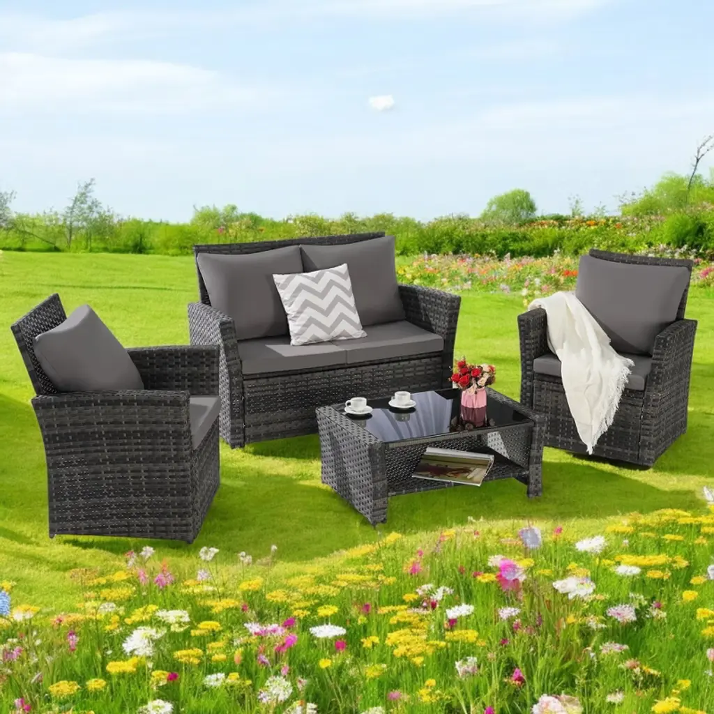 "Outdoor Furniture Sets and Patio Furniture ¨C 4-Piece Grey PE Wicker L-Shaped Set with Glass Table (TROPOW Brand)"Key Features:Complete 3+1 Piece Set ¨C Includes 2 single sofas (300 lbs capacity each) + 1 loveseat + 1 tempered glass coffee table (Dimensions: 25.59"x24.41"x14.96", Total Weight: 35.1 lbs)All-Weather Durability ¨C Features powder-coated iron frames and UV-resistant PE wicker that withstands sun/rain. 5mm tempered glass table resists scratches.Comfortable Design ¨C Includes 5mm thick cushions with 180g chemical fiber fabric for lasting comfort. Grey wicker with black frame offers modern style.Space-Saving L-Shape ¨C Compact L-shaped configuration fits balconies/sunrooms (Assembly required). Lightweight yet sturdy for flexible arrangement.Easy Maintenance ¨C Water-resistant cushions wipe clean easily; PE wicker only needs occasional dusting. Ideal for indoor/outdoor use.