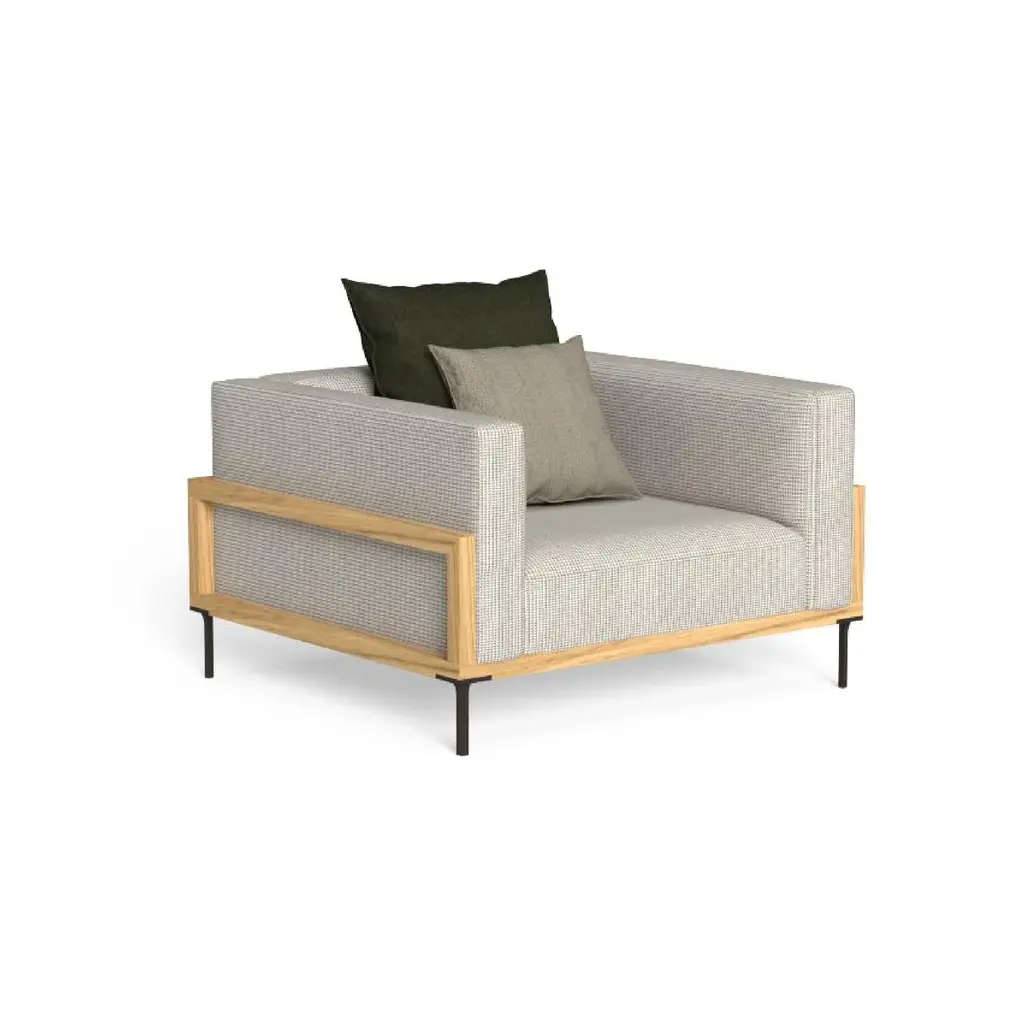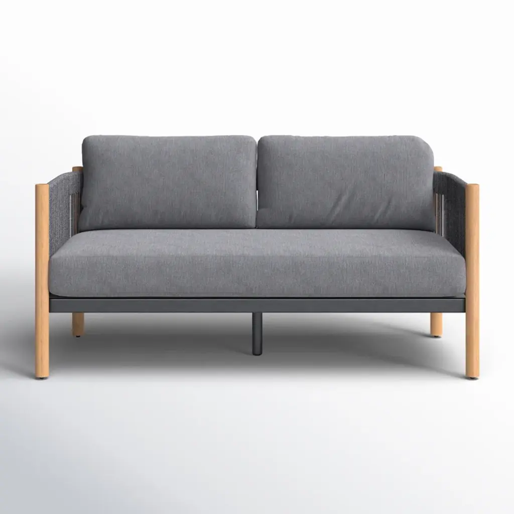 Welcome comfort and durability to your favorite outdoor spaces with the Tulum 2-Seater Sofa from Vondom. Designed by Eugeni Quitllet, this sleek sofa features high-quality materials and advanced technology for both indoor and outdoor use. Elegantly harmonizing aluminum with solid teak wood, this sofa features a comfortably padded seat and back, wrapped in durable PET upholstery crafted from recycled plastic bottles. Kick back and relax on a patio or poolside, in the perfect spot to entertain or catch some sun. Highlights