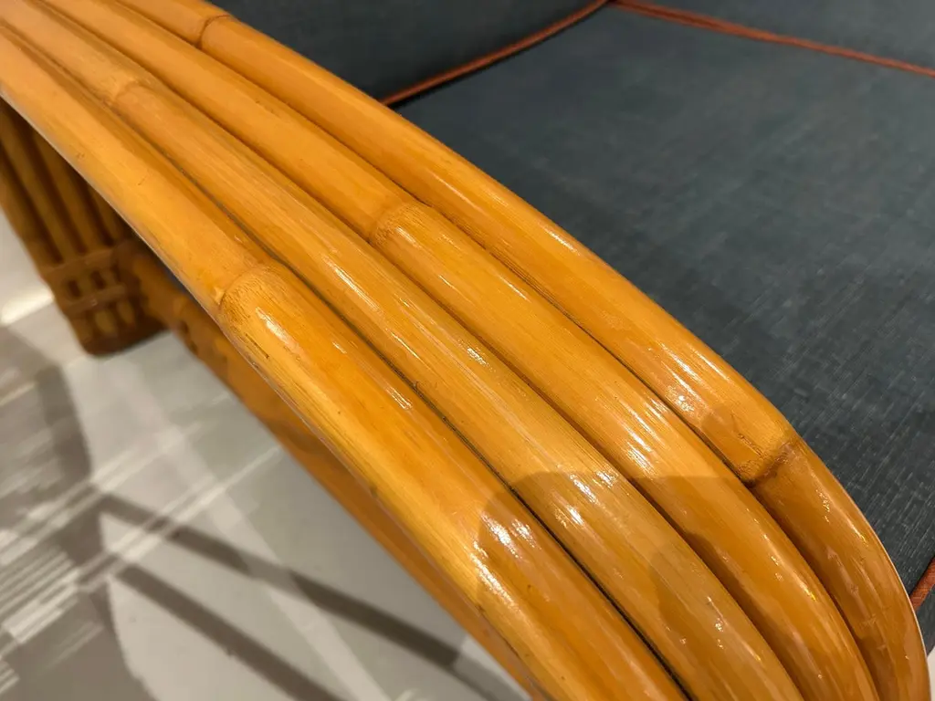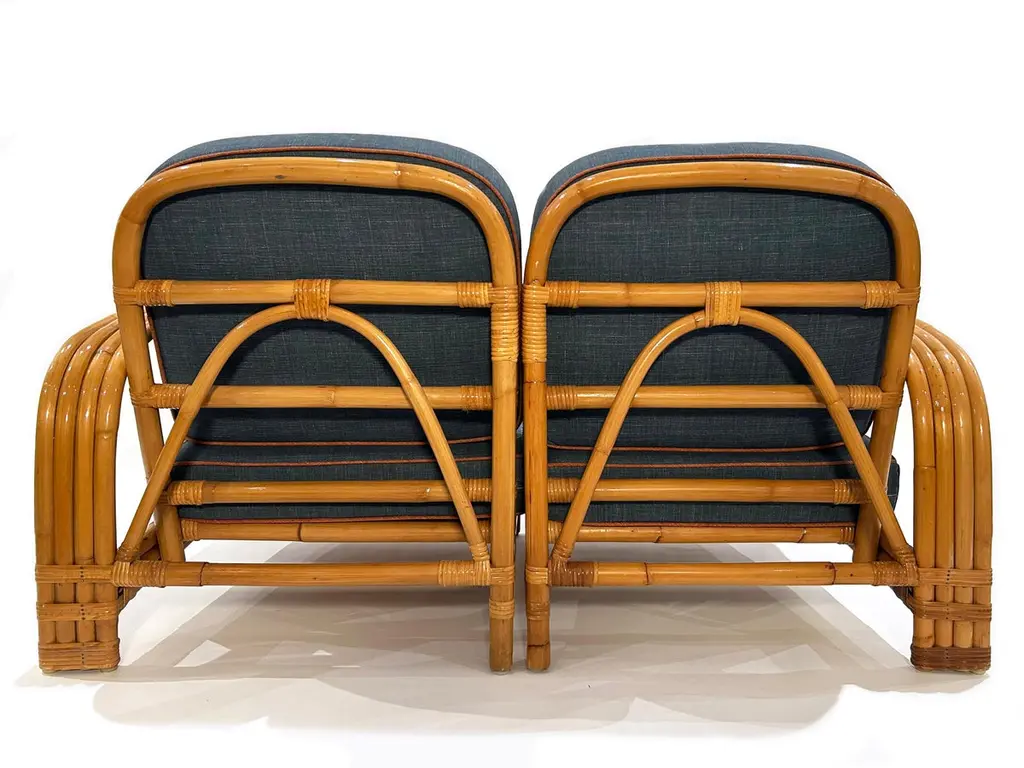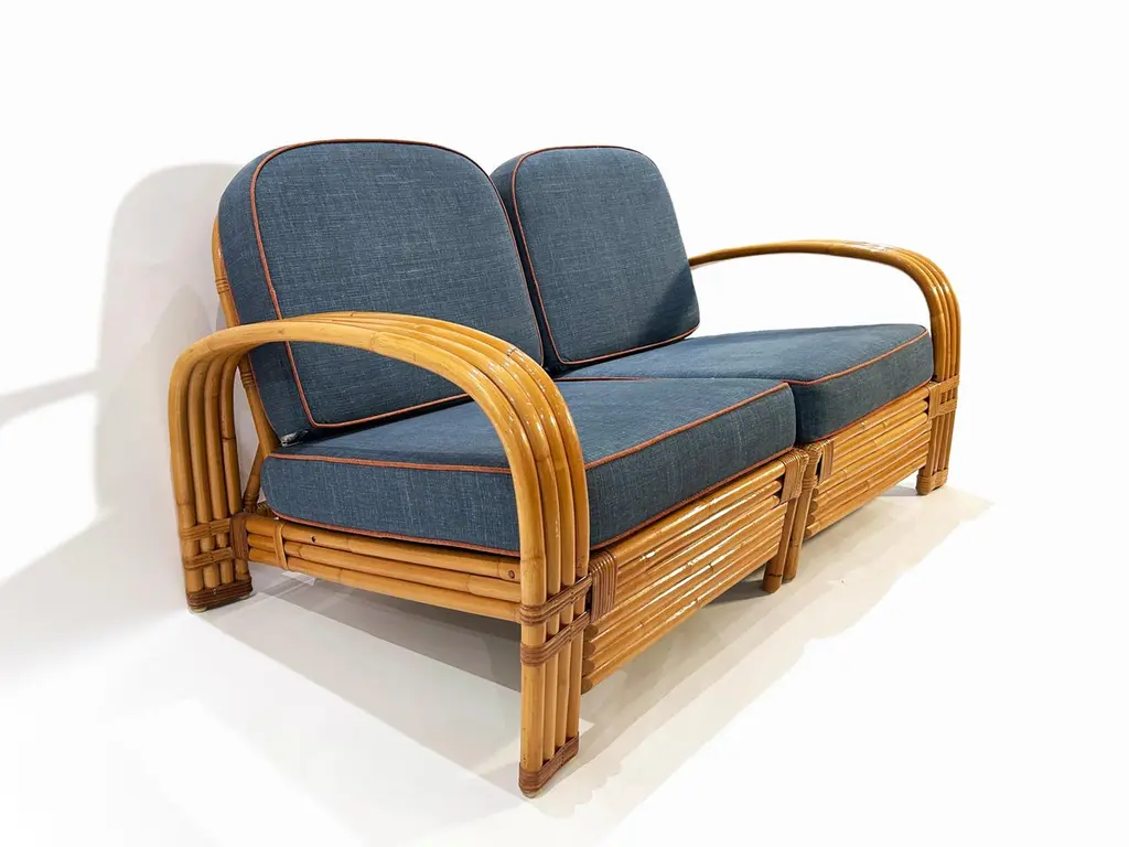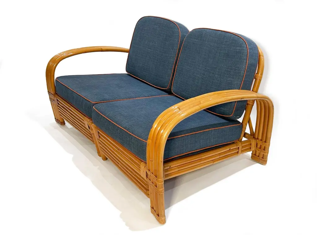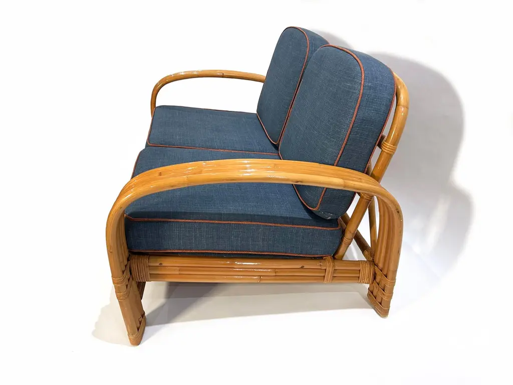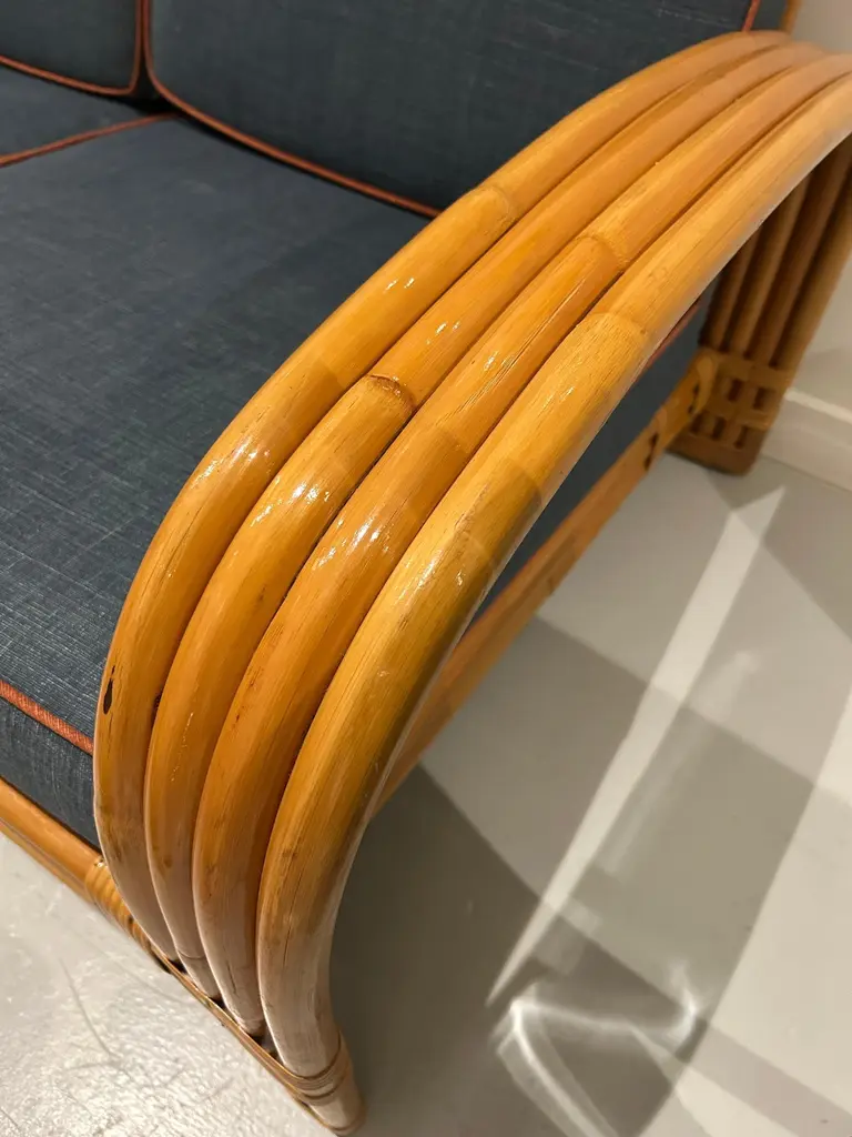 Two-seater modular rattan sofa with blue fabric cushions and seat base coverings. The four loose cushions are 4 3/8" thick, have red welting and are zippered. The frames were refinished in 2022 are in great condition.Arm height: 20 7/8"Seat depth: 21 7/8"