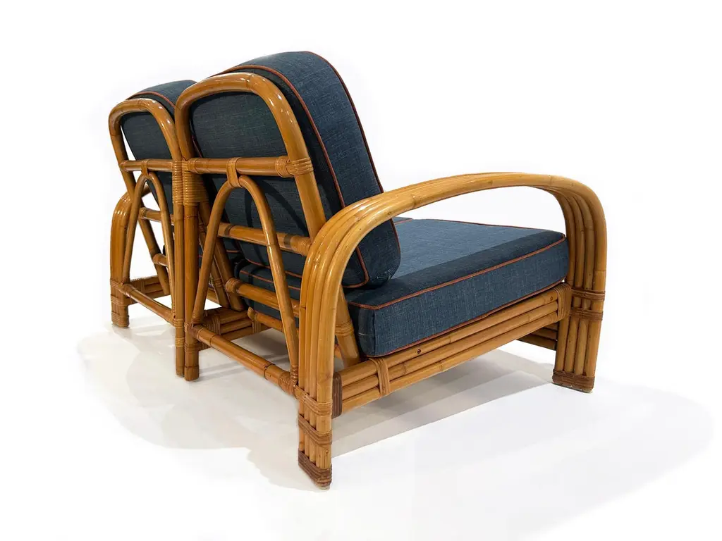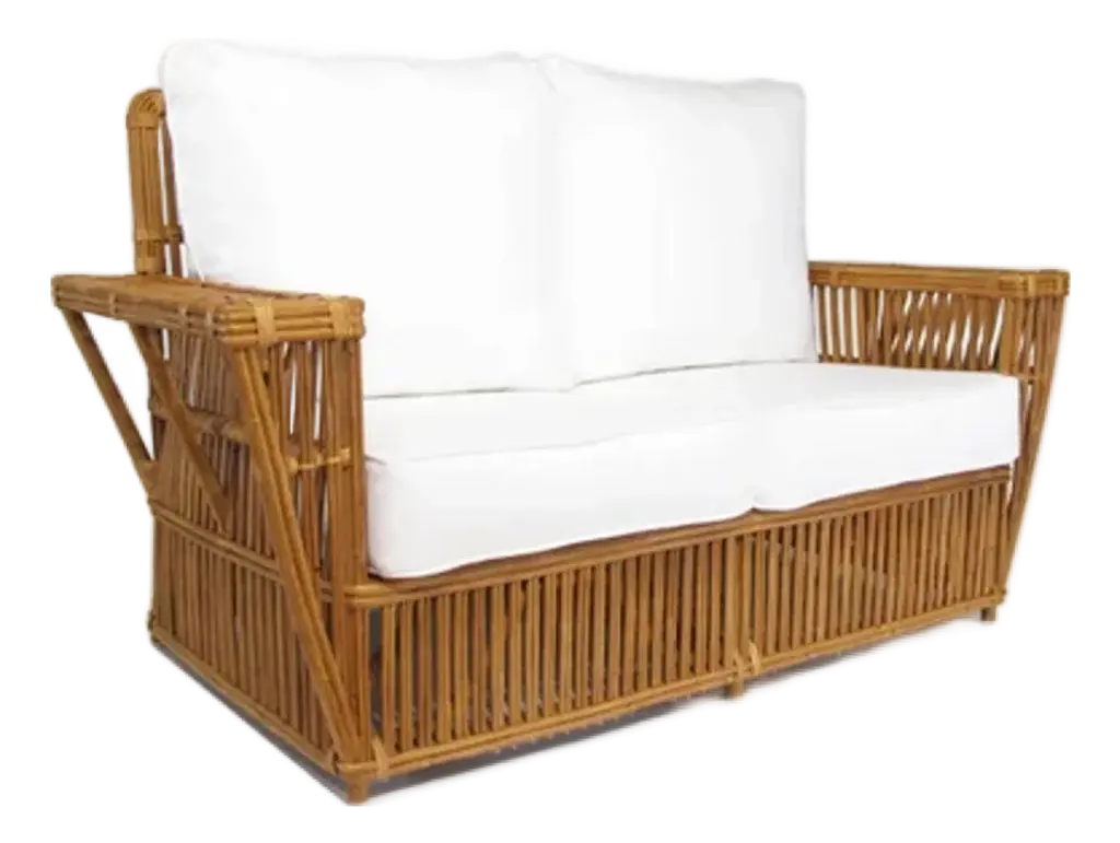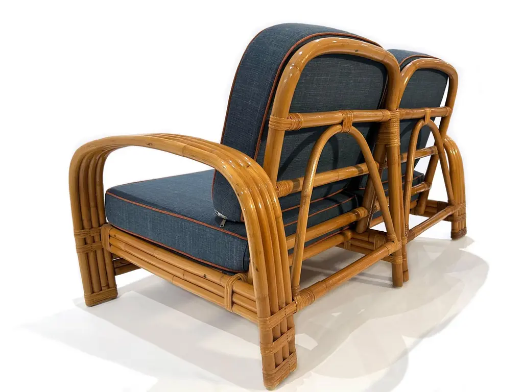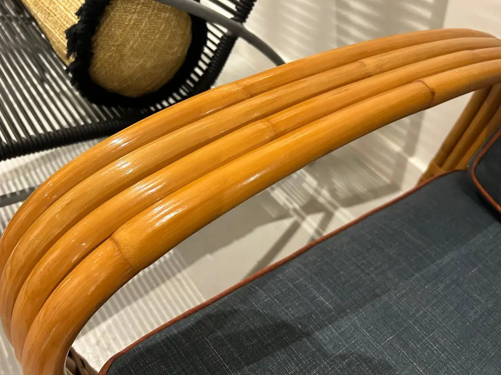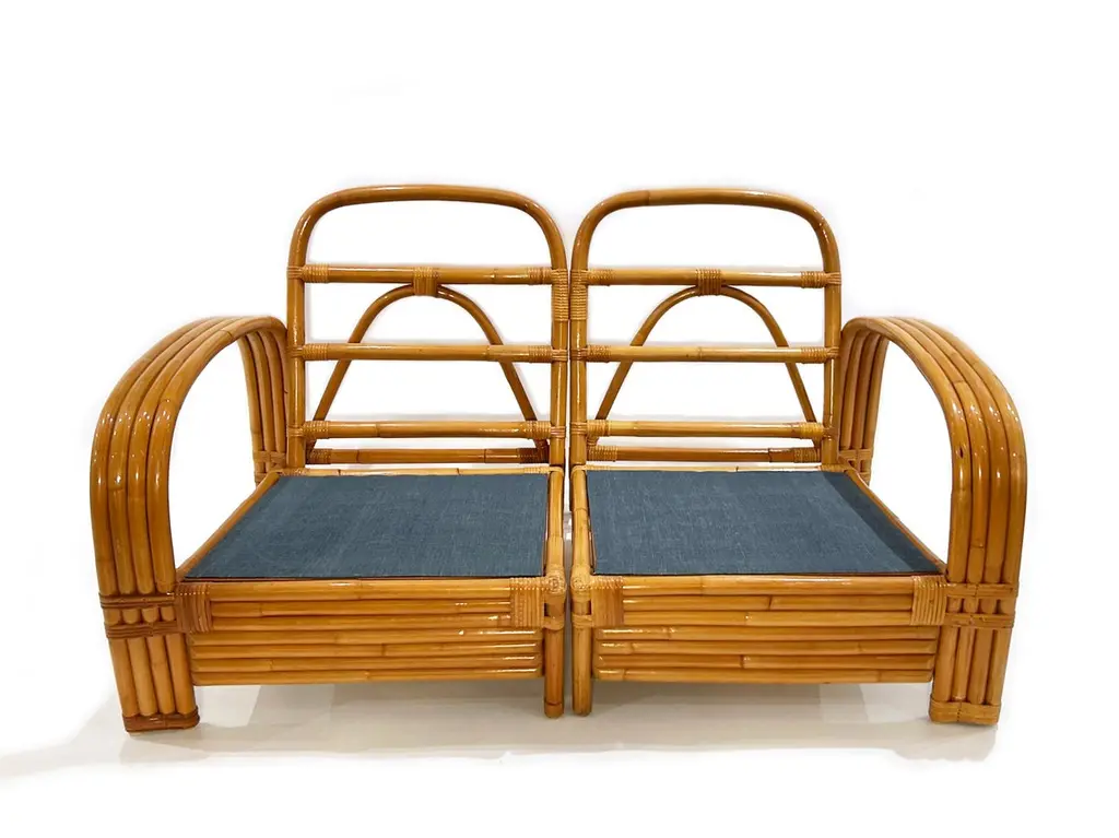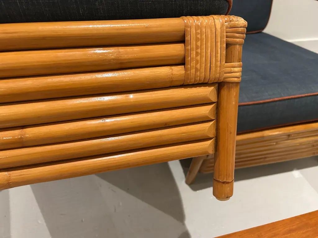 Two-seater modular rattan sofa with blue fabric cushions and seat base coverings. The four loose cushions are 4 3/8" thick, have red welting and are zippered. The frames were refinished in 2022 are in great condition.Arm height: 20 7/8"Seat depth: 21 7/8"